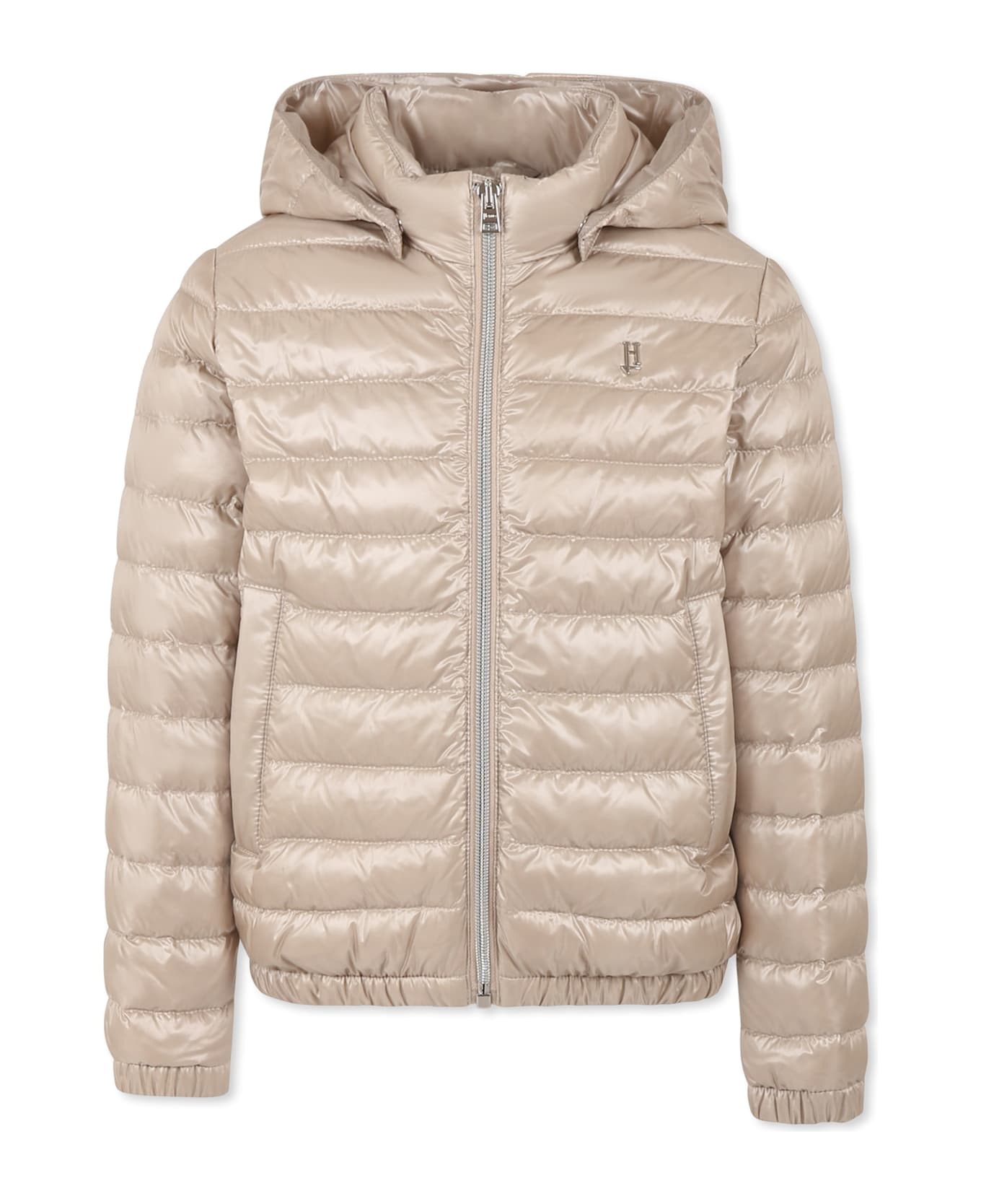 Beige 100 gram down jacket, padded and quilted, long sleeves, with removable hood, front zip closure, side pockets with snap button, elasticated cuffs and hem. It is embellished with a logo patch on the chest.