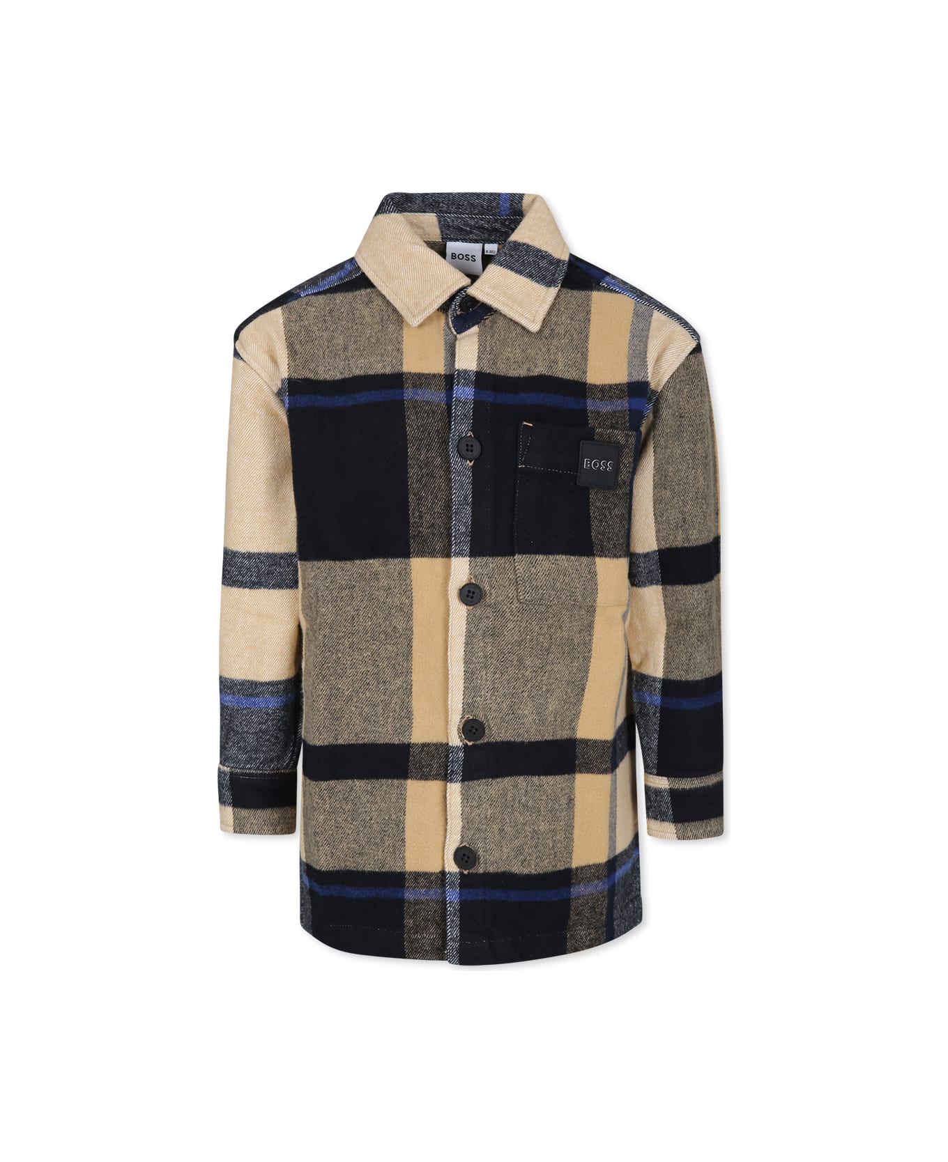 Beige checked cotton shirt, long sleeves, pointed collar, front button closure and patch pocket on the chest. It is embellished with logo on the chest.