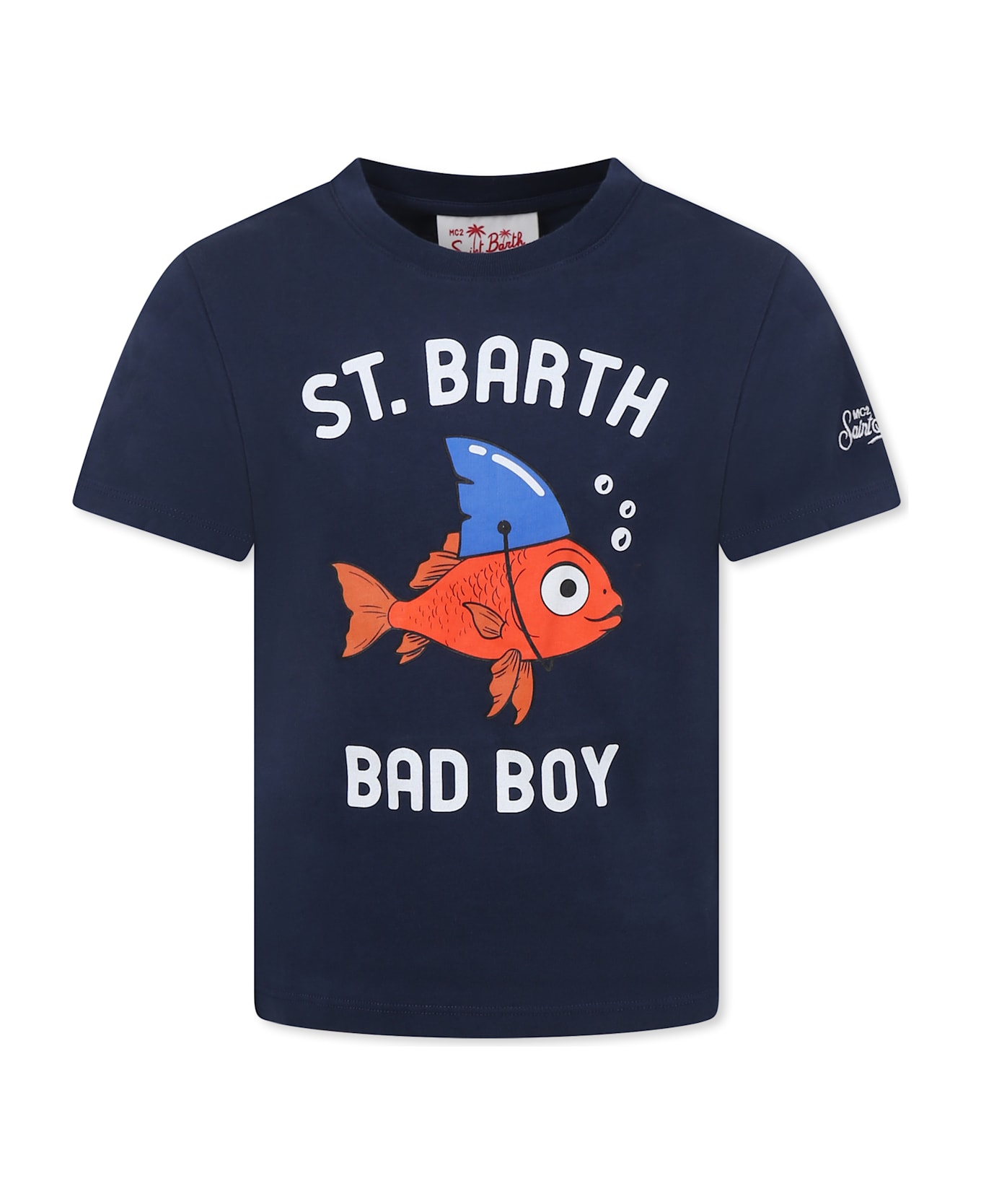 Blue organic cotton t-shirt, with short sleeves and ribbed crew neck. It is embellished with goldfish and logo print on the front and with embroidered logo on the sleeve.
