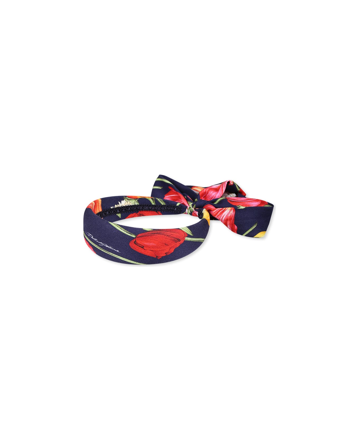 Blue headband from the Italian luxury brand Dolce & Gabbana Kids, lightly padded, with bow. It is embellished with tulips print and logo.