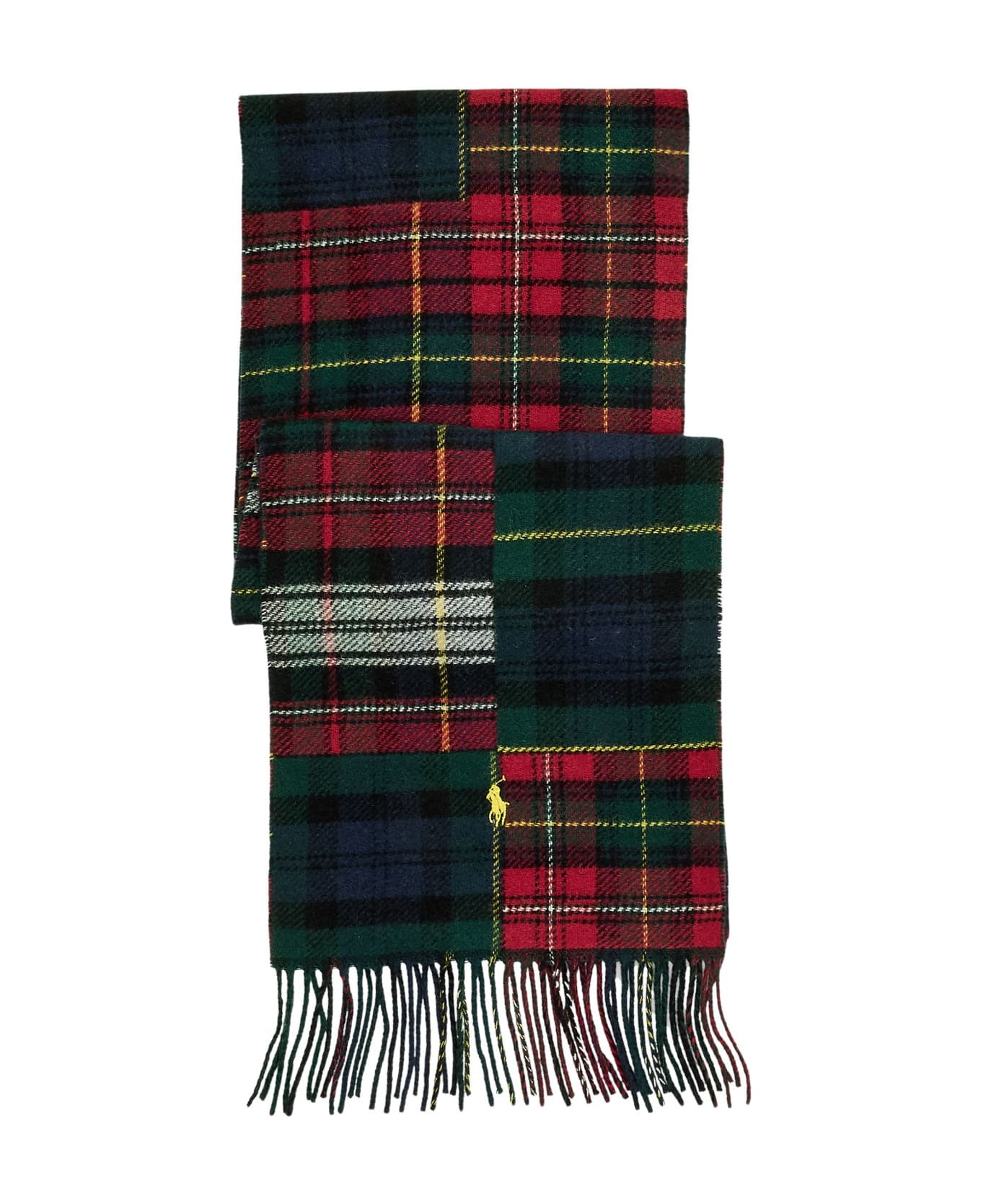 red/multicolour recycled wool blend textured finish patchwork design plaid check pattern signature Polo Pony motif fringe detailing wraparound style