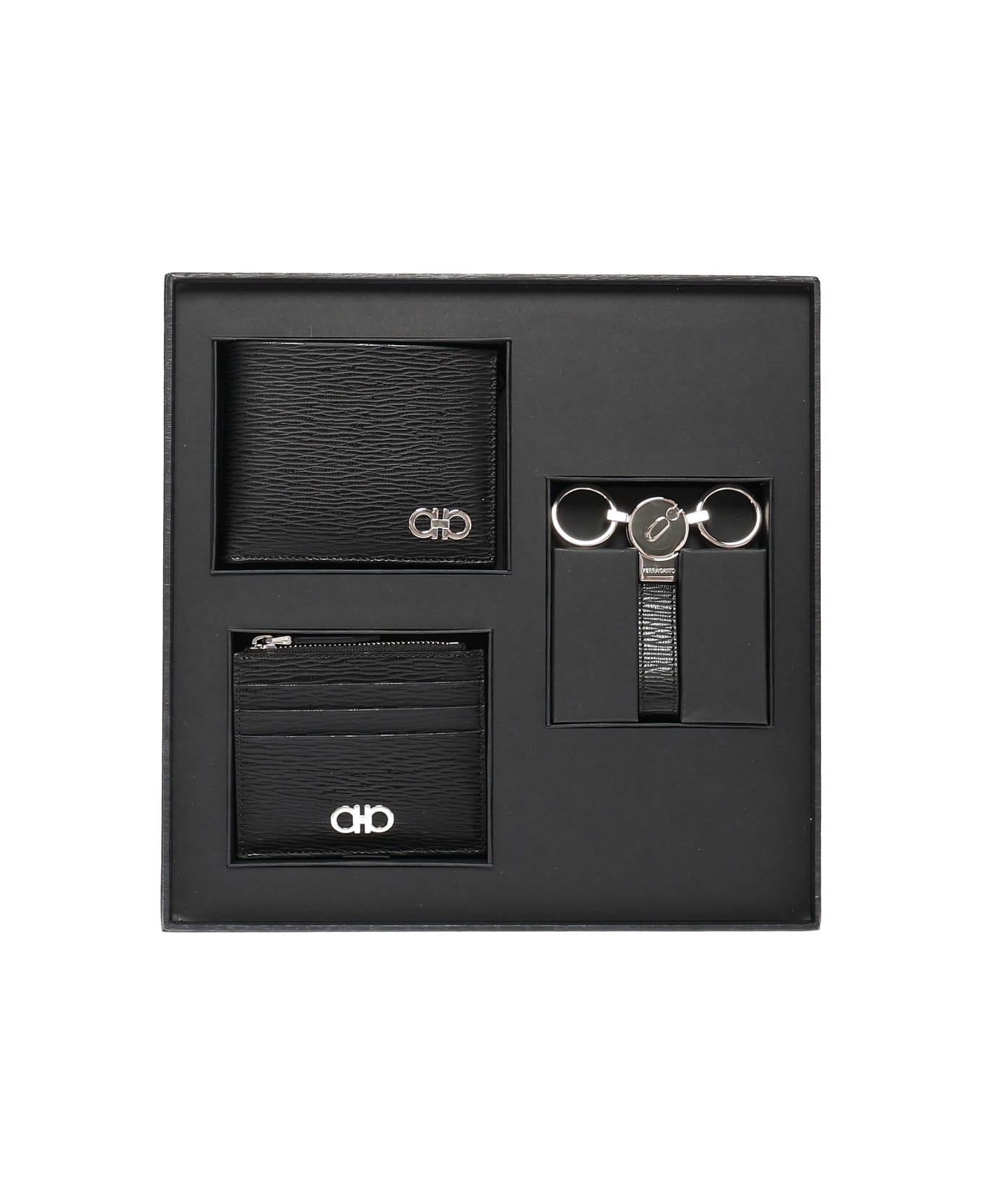 -Made of calfskin -Includes: 2 wallets and a keychain -Made in Italy -Color: Black
