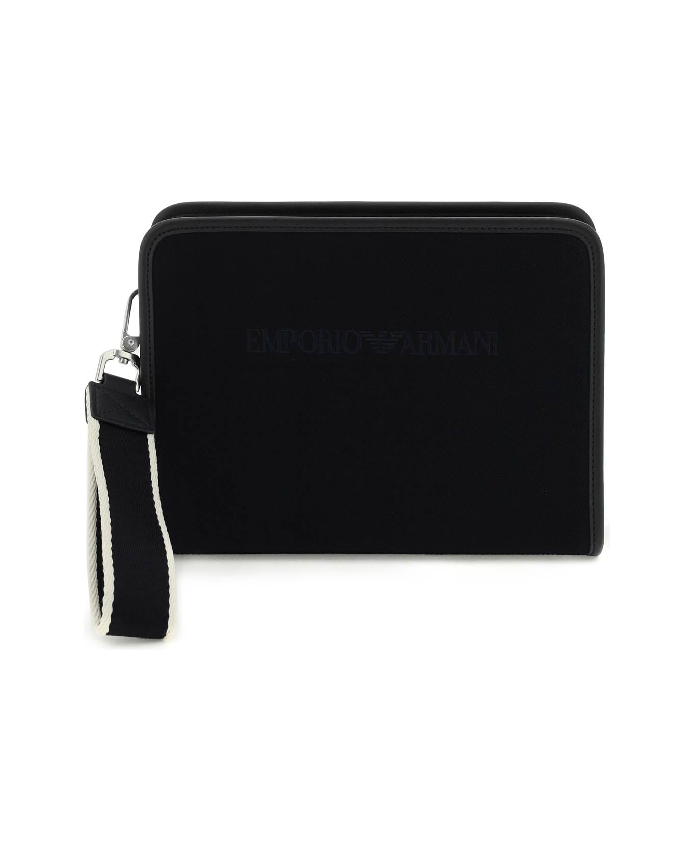 Emporio Armani cotton canvas pouchwith a boxy design and tone-on-tone embroidered lettering logo. Zipper closure, fabric interior with one open leather pocket and detachable wrist handle. Composition: 100% CO