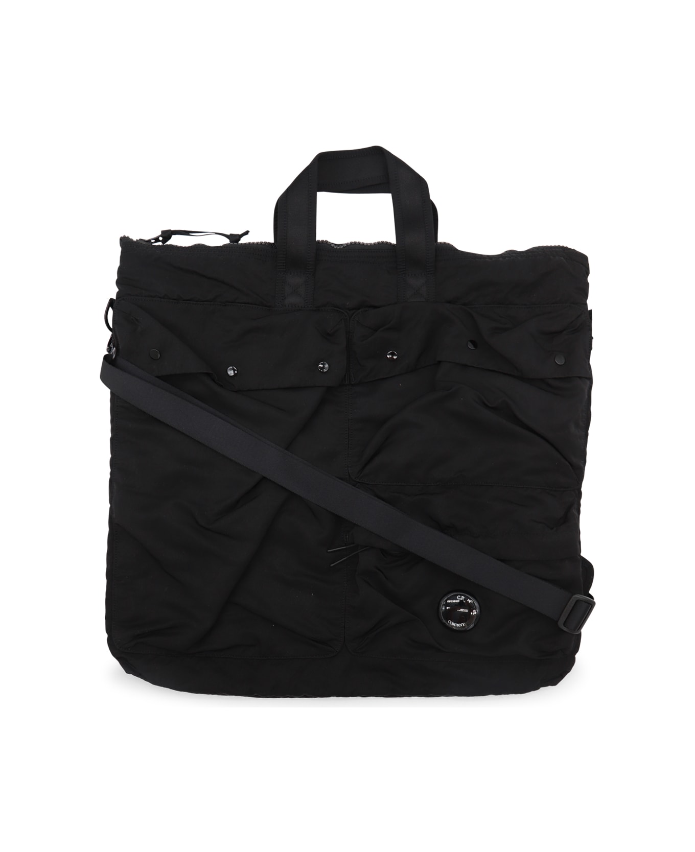 Black tote from CP Company featuring top handles, main compartment, removable adjustable strap and pockets. Composition: _, 100% Polyamide