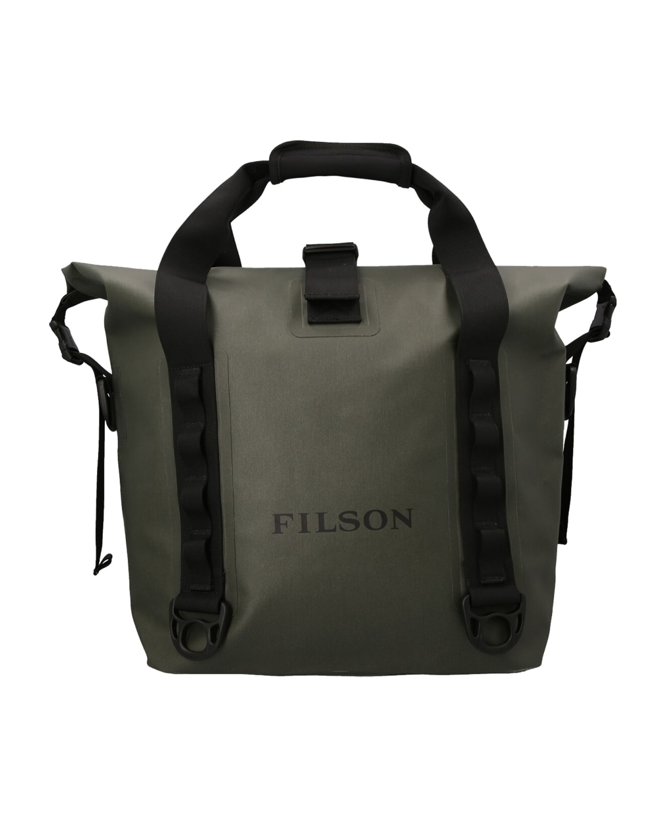 'Dry Roll-Top' shopping bag in durable and flexible TPU 840D nylon with RF welded stitching, waterproof roll-top closure with side buckles, wide handles with neoprene handle, SPRING loops and D rings for securing equipment, adjustable and removable shoulder strap with shoulder pad.