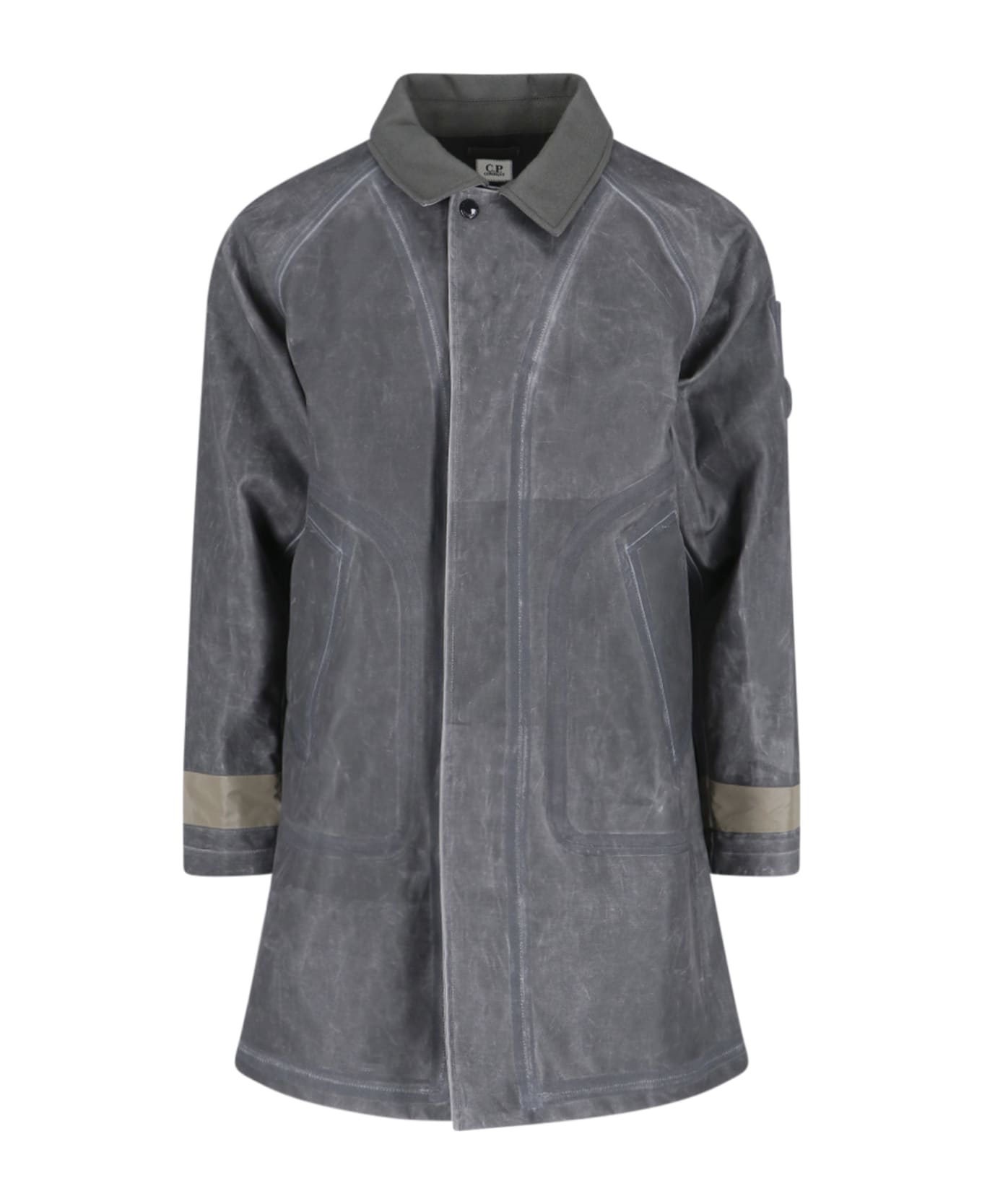 C. P. Company Toob coat in gray "Toob" with classic collar, zip and button closure, worn details, two front pockets, shoulder zip pocket with "C. P. Company lens" hardware detail, back slit, straight hem.