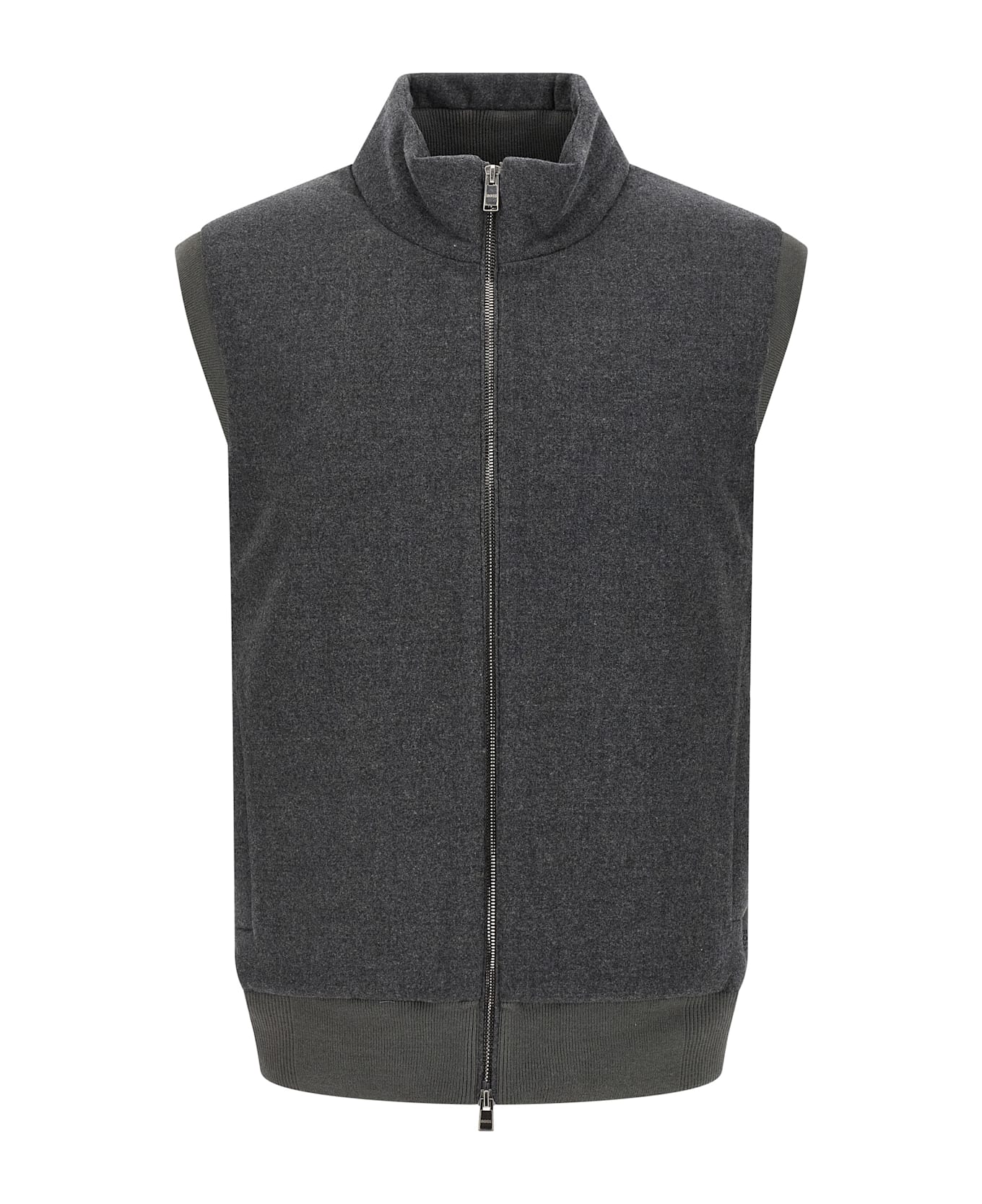 Virgin wool 'Heflono' vest with padded Tech Flannel front, standing collar, front zip closure, pockets, band on the bottom of the garment. Composition: 55% polyester, 45% wool