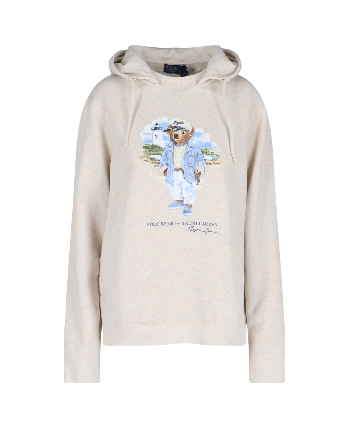 Polo Ralph Lauren Polo Bear hoodie in cream cotton blend with drawstring hood, maxi multicolor logo print on the front, two side pockets, ribbed trim, and straight hem.