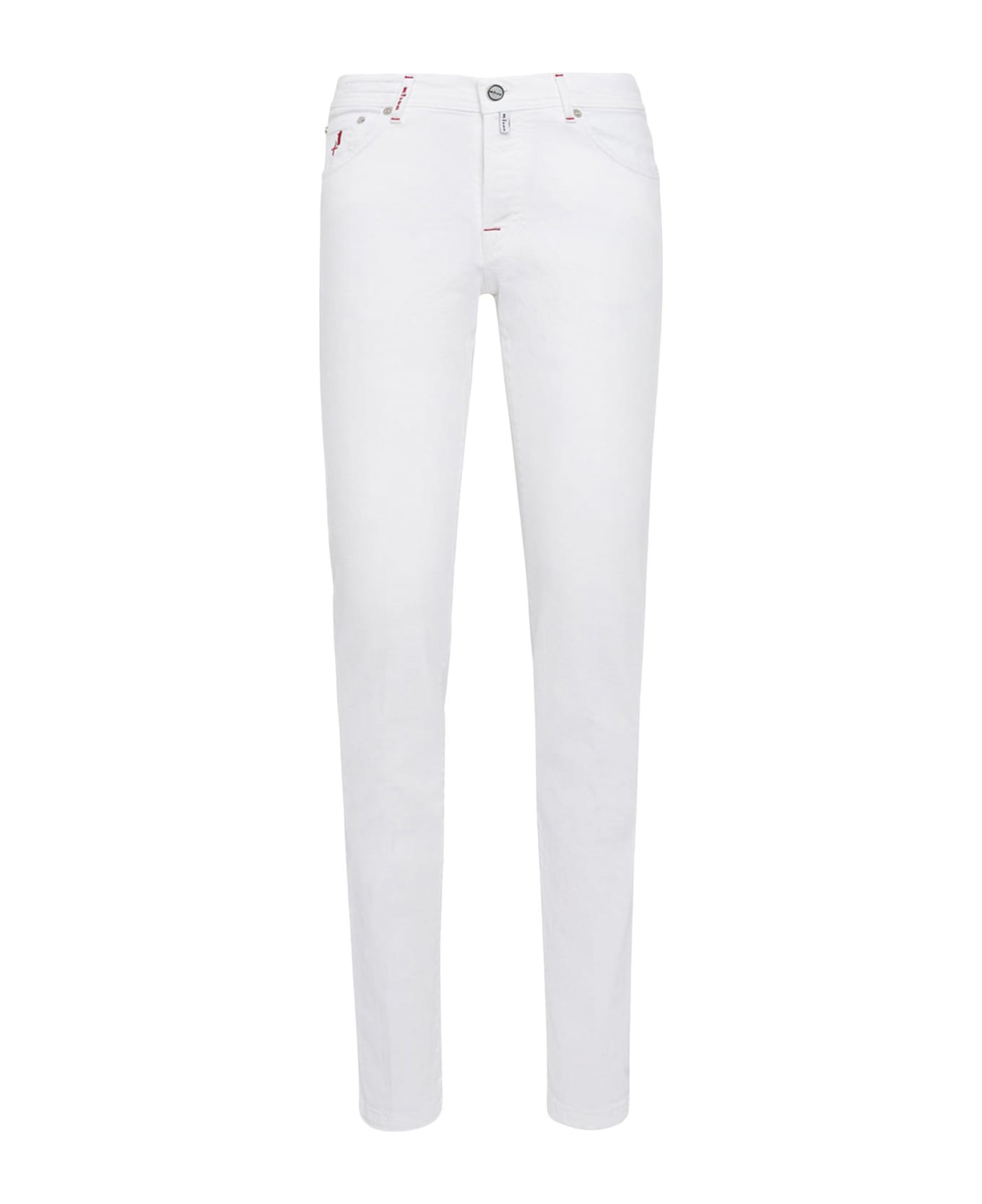 White ultra-slim, low-rise, five-pocket jeans in Kurabo, the finest Japanese denim there is, made of organic cotton on vintage American machinery. An icon of relaxed, contemporary elegance, Kiton jeans offer lightweight durability thanks to double stitching, making them nearly indestructible. A small amount of elastane in their composition makes these jeans extremely comfortable: the fabric gently hugs the leg without losing its shape. Sewn without darts, these trousers have tone-on-tone topstitching, red bar tacks, and red kick tape to reinforce the hem. Essential lines define this versatile garment, designed to enrich casual-chic and sporty looks. The opening of the leg is 19. 5 cm on a base size of 50 (Italian). We recommend hand washinginside-out at 30 C.