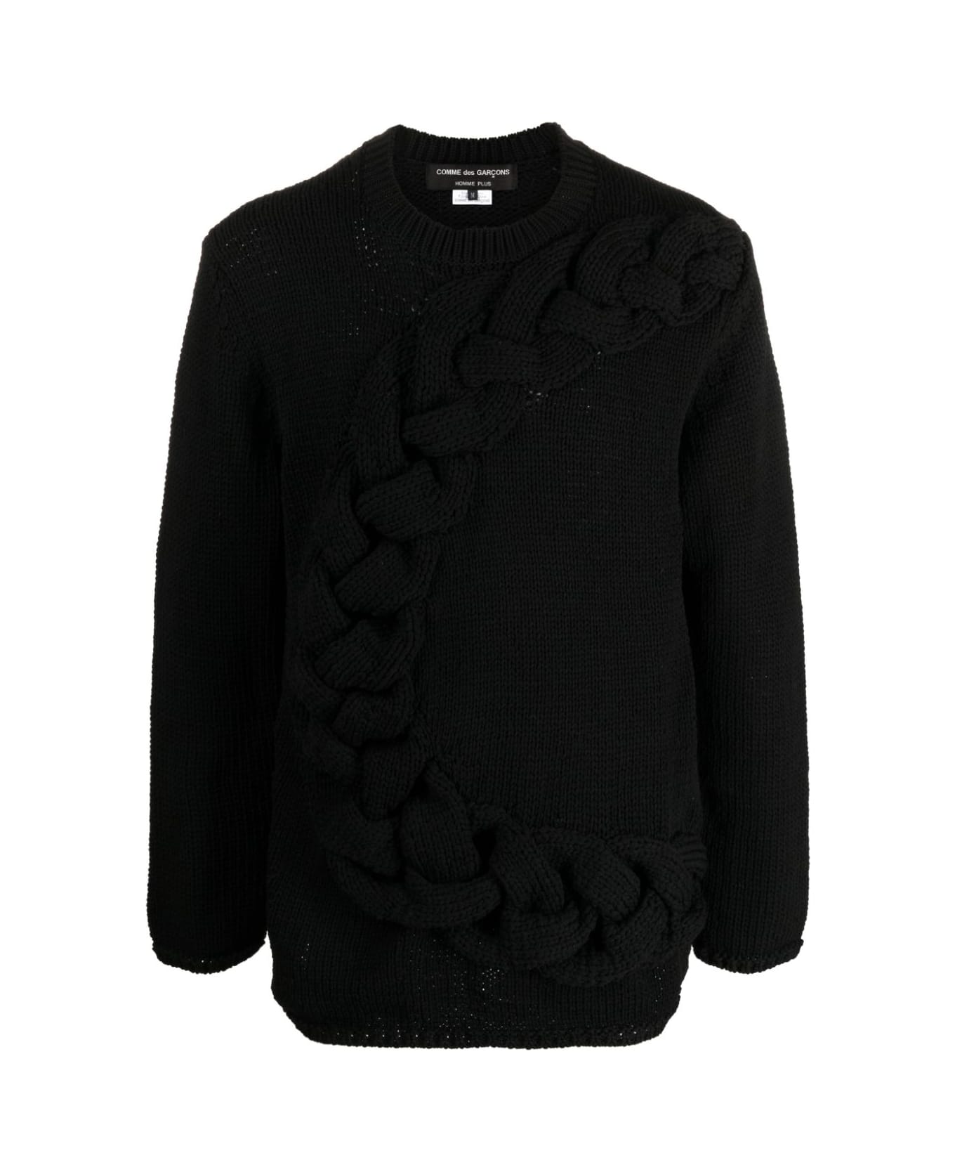 core black chunky cable knit crew neck drop shoulder long sleeves ribbed cuffs and hem