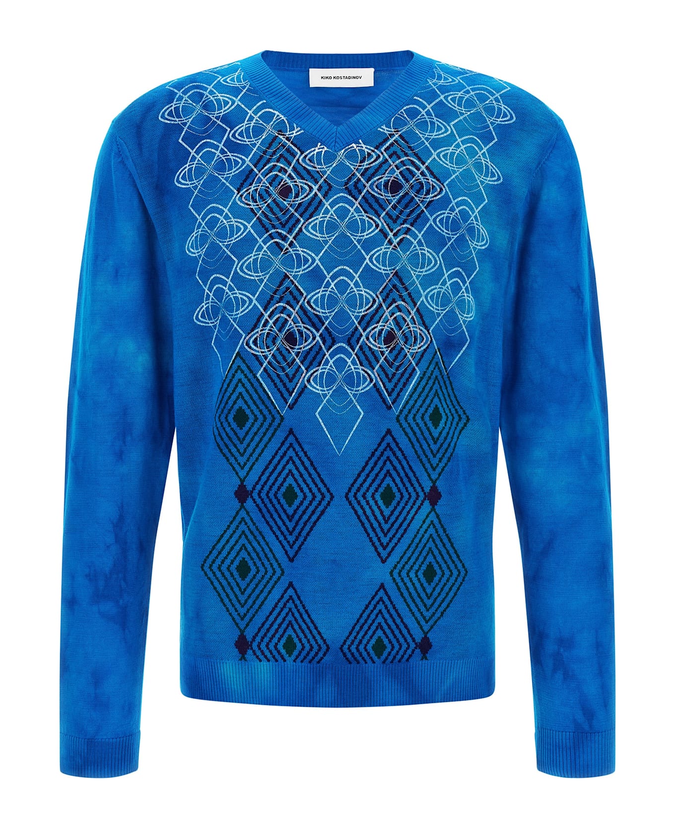 'Hatha' jacquard knit sweater with geometric patterns inspired by Bulgarian folklore and superimposed on a psychedelic tie dye print, V-neck, long cuffed sleeves, and headband. Composition: 100% wool