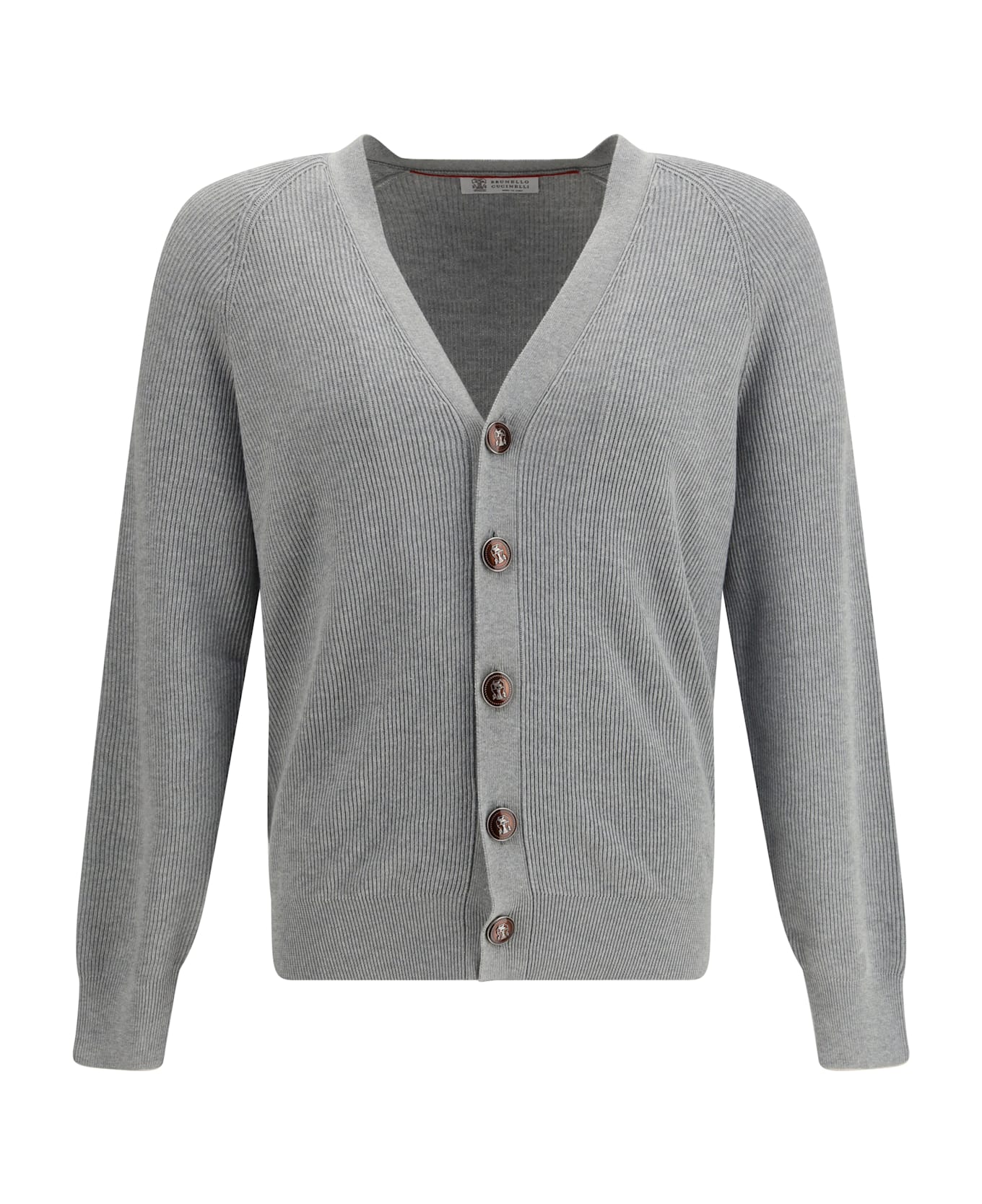 The signature cotton cardigan by brunello cucinelli combines quality materials with a sophisticated and versatile design. featuring a v-neck on the front and a contrasting front button closure, the cardigan has ribbed cuffs and a ribbed hemline that ensure a comfortable, well-structured fit. the ribbed design adds a refined texture, making this garment a smart-casual wardrobe essential.