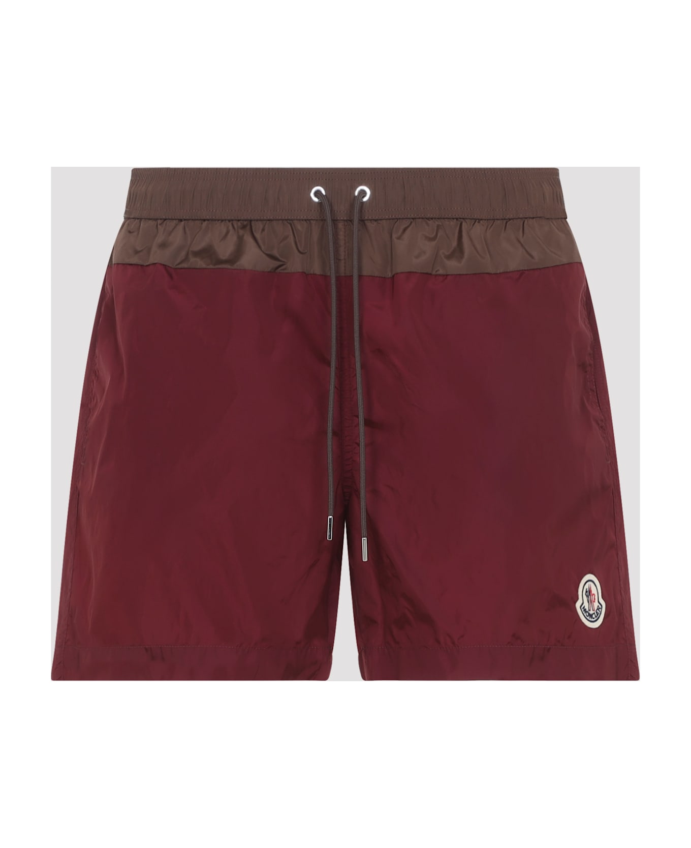 Moncler Red Polyamide Swim Shorts. Crafted from red tech fabric, featuring a top brown insert, an elastic waistband with drawstring, inseam side pockets, a logo patch at the front hem, a zip pocket on the back, and a mesh lining.