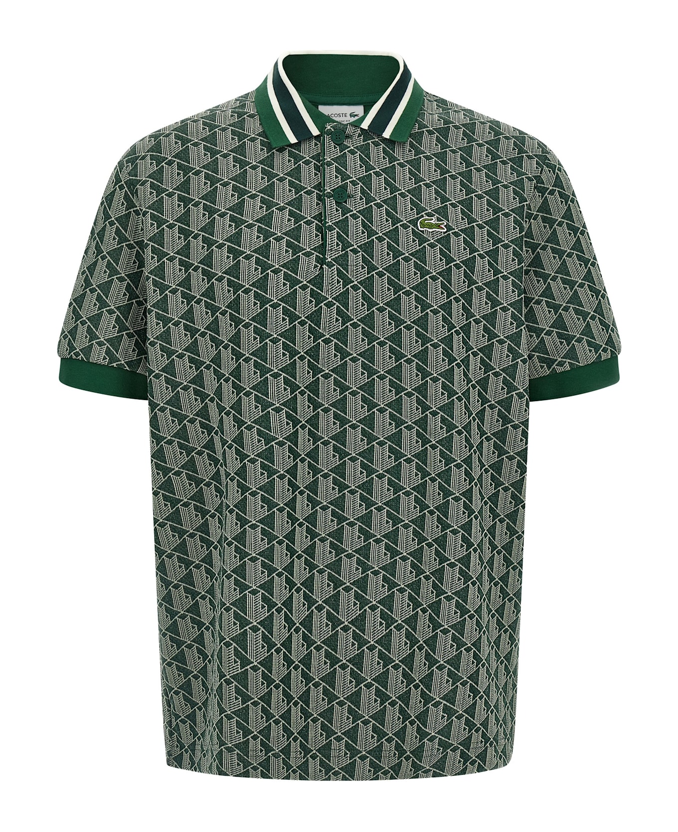 'Paris' vintage jacquard monogram cotton blend polo shirt with ribbed and button stretch knit collar, front logo patch, short cuffed sleeves.