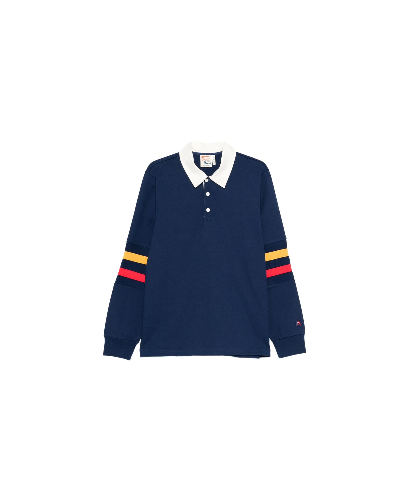 dark blue stripe detail polo collar front button placket long sleeves appliqué logo