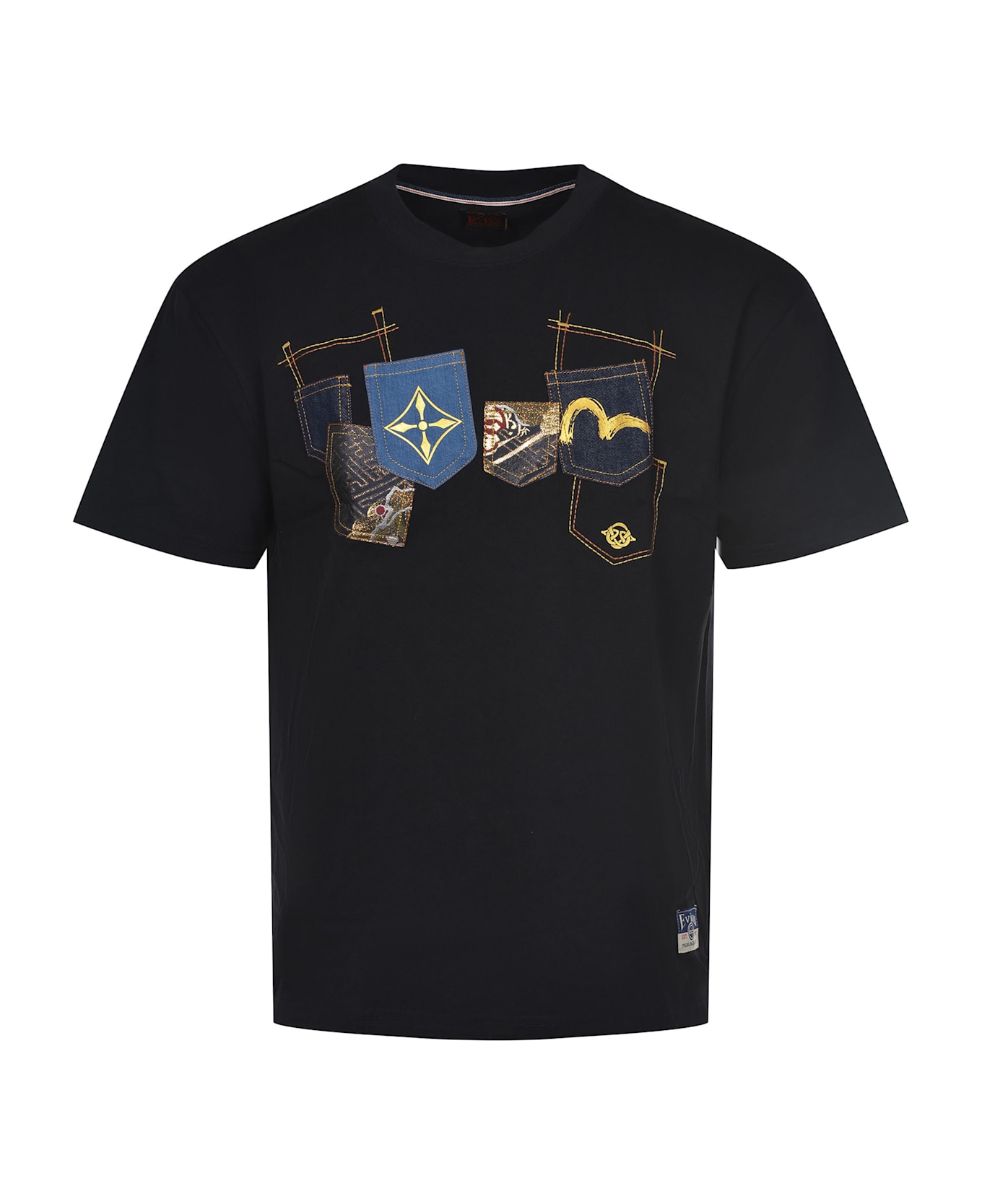 Evisu T-shirt made of Black cotton. Ribbed crew neck. Short sleeves. Embossed pockets on the chest in contrast with embroidered motifs and logo. Logo patch on the bottom. Contrasting lettering on the back of the crew neck. 100% cotton