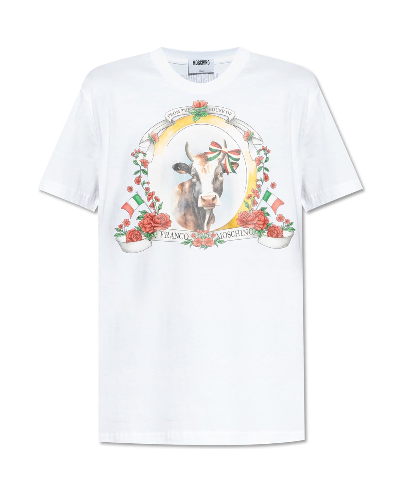 Experience timeless sophistication with this Moschino Printed T-Shirt, expertly crafted from luxuriously smooth cotton. The crisp white canvas serves as the perfect backdrop for a vivid, large-scale print depicting a realistic cow's head adorned with an Italian-flag bow, masterfully framed by striking red floral motifs. The classic straight silhouette, crew neck, and short sleeves ensure a flattering, versatile fit that transitions seamlessly from day to night. The signature FRANCO MOSCHINO inscription underscores the shirt's exclusive heritage, capturing the founder's whimsical, optimistic approach to high fashion. Each detail radiates the playful spirit and distinctive artistry that define the Moschino legacy. Why choose this product? Crafted from premium cotton for exquisite comfort and breathability Eye-catching design featuring bold, artful prints exclusive to Moschino Celebrates the renowned heritage and playful luxury of Franco Moschino Perfect fusion of contemporary style and timeless quality