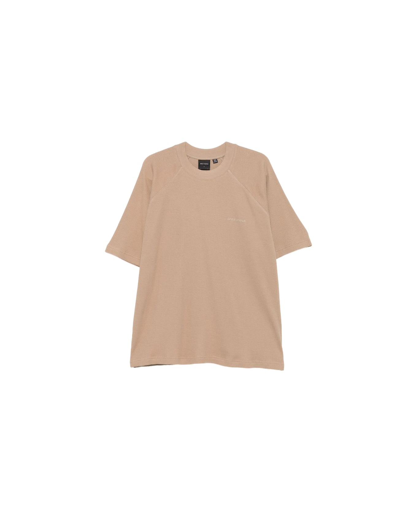 light brown waffle knit raglan sleeves crew neck straight hem embroidered logo