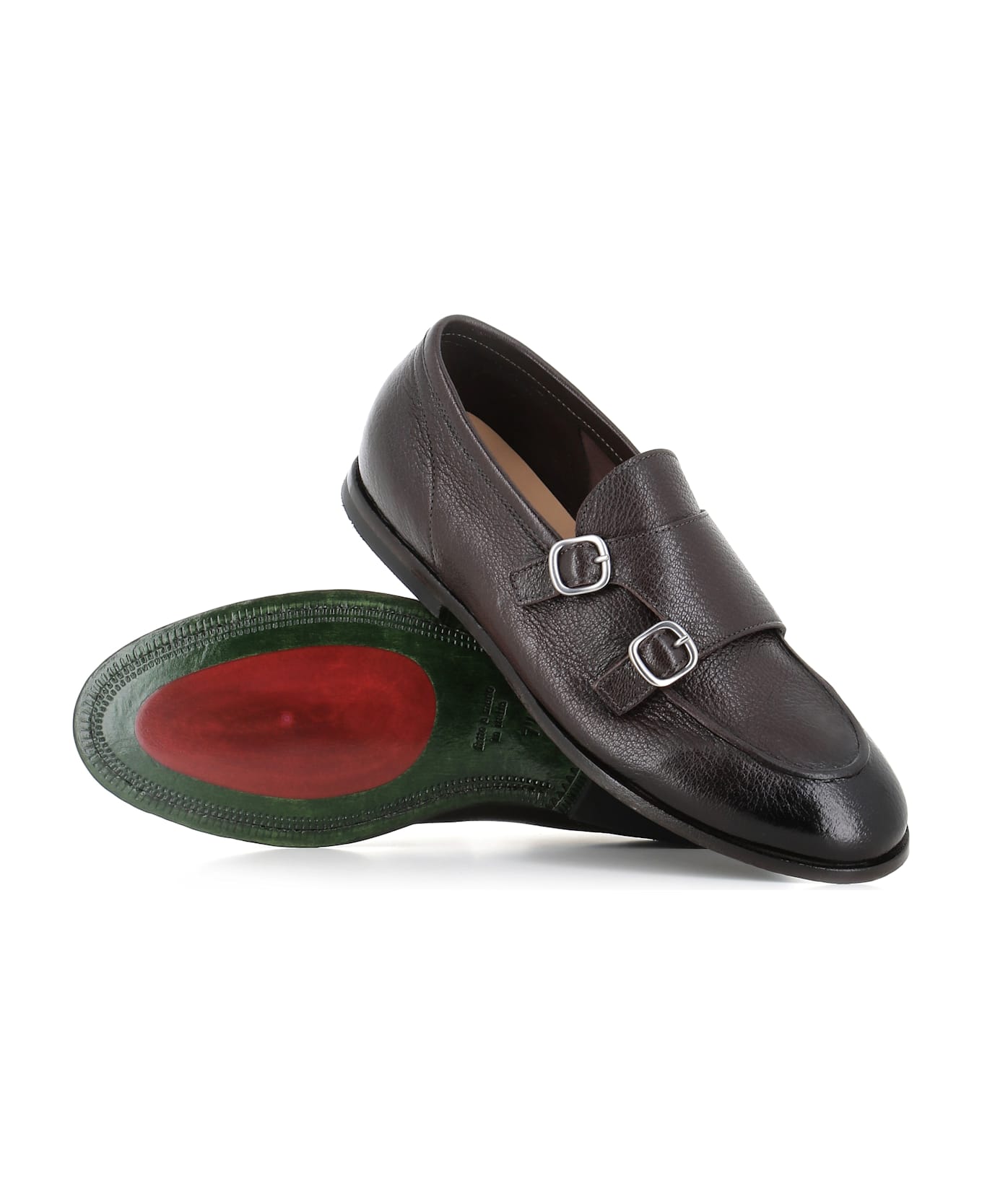 Dark brown men soft leather loafer by Green George, featuring by an almond toe and a silver decorative buckles. Leather sole with rubber. Unlined interior. Heel: 1,5 cm