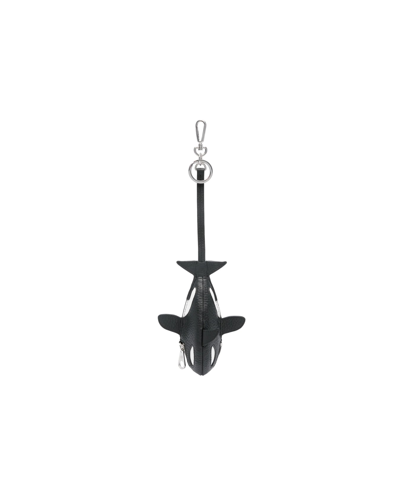 black, white calf leather pebbled texture orca shape keyring attachment losbter claw clasp logo stamp to the rear main compartment logo-engraved silver-tone hardware front zip fastening