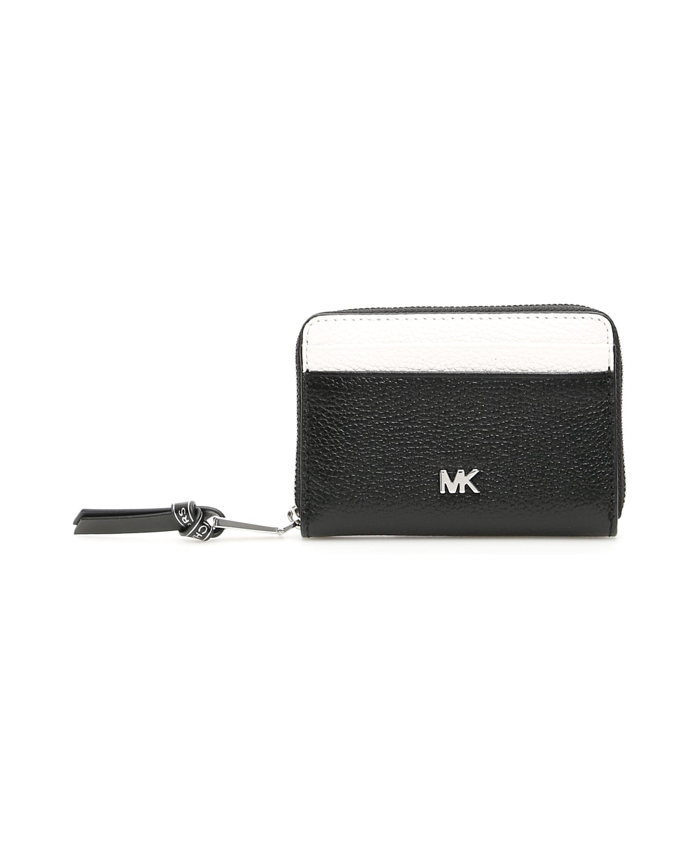 Michael Kors grain leather wallet with two contrast leather slit pockets on the front and back. Silver-tone metal MK logo, zip closure, logo twill lining. It features two gusseted compartments, central zip pocket, four credit card slots.