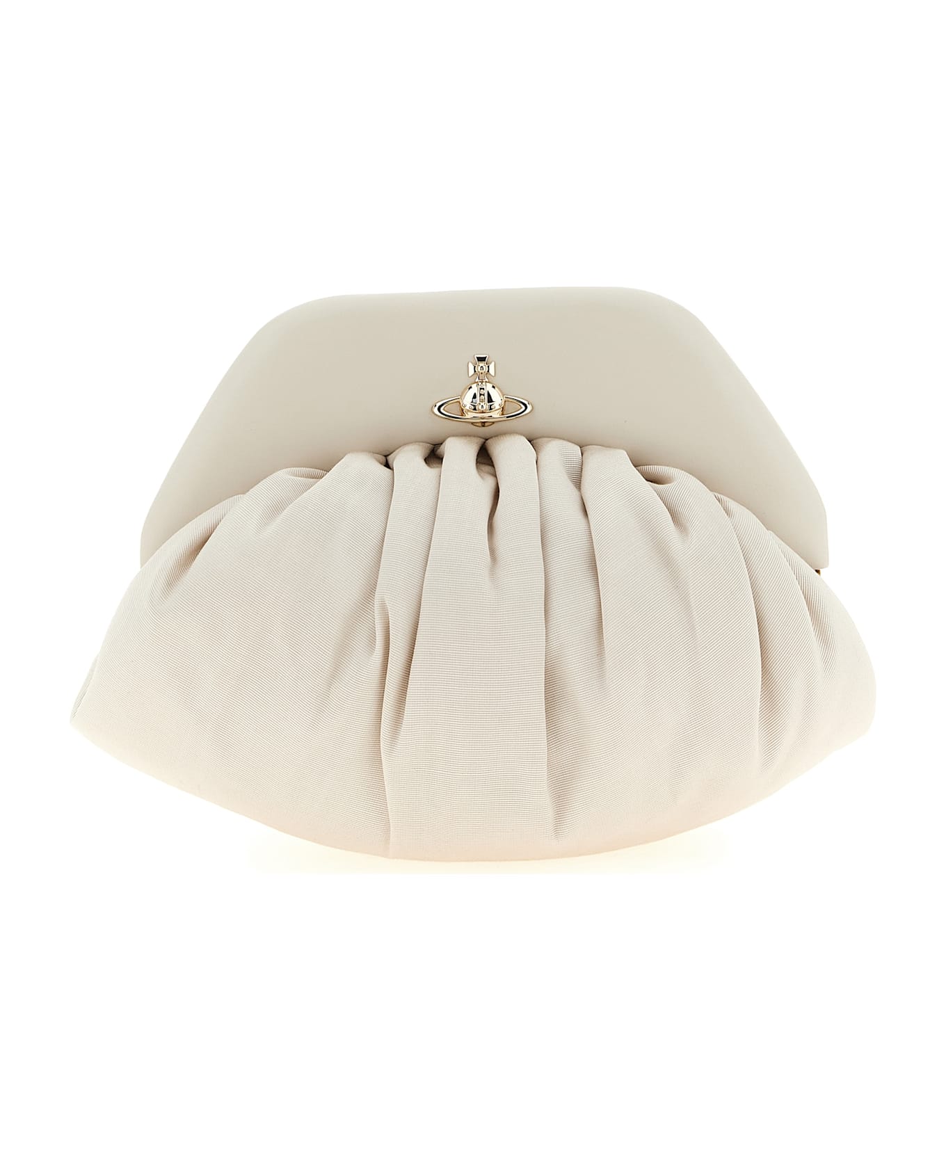 Brooke' clutch in Moiré fabric, magnetic closure with outer leather-effect fabric and metal acting as an inner mirror, metal Orb logo on the front, and removable 'Hazel' handle. Composition: 100% viscose