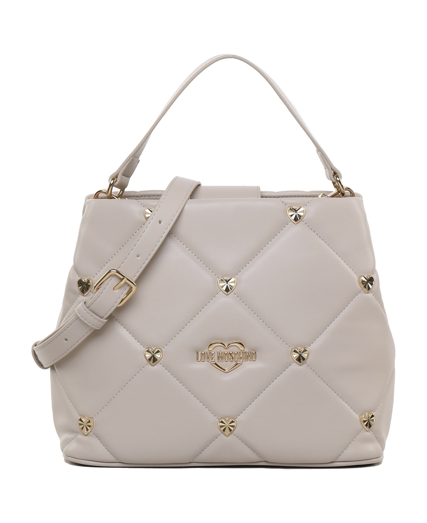 Ivory Quilted Bag With Chains And Leather Handle from Love Moschino -Quilted tote bag with logo plaque -Plate with gold-colored logo -Chain shoulder strap -Flat handle -Single compartment -Dimensions: 25x20x12cm -Made in Italy -Colour: Ivory -100% Calfskin