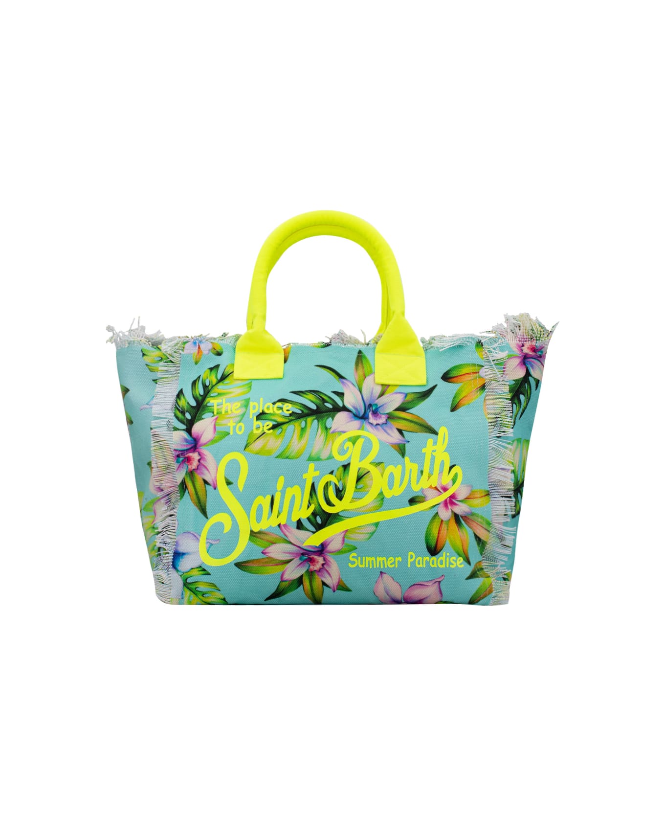 Canvas shoulder bag with all over tropical print, printed St. Barth logo, zipped inside pocket. Dimensions: 40 x 32 x 20 cm. Composition: 100% CO