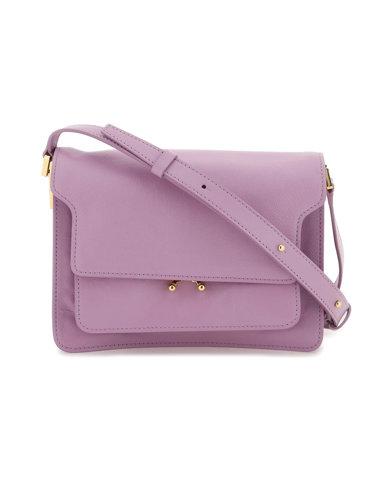 Marni Trunk Soft medium bag crafted in soft leather with adjustable shoulder strap, side metal details with engraved logo and flap with metal snap closure. Rear open flat pocket, two gusseted compartments, a central zipped flat pocket, an open flat pocket and a front gusseted pocket. Cotton lining. Gold-finished metalware.