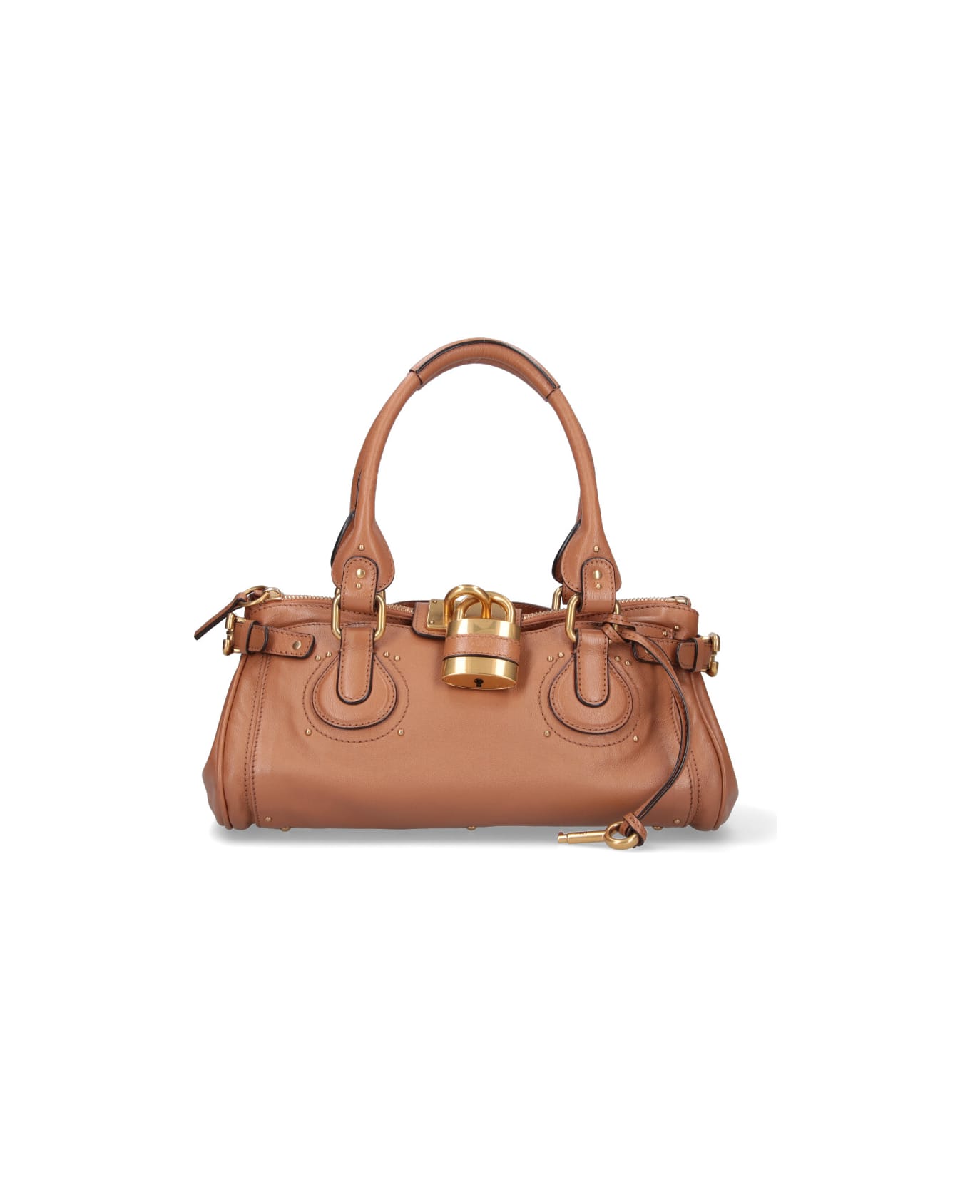 Chloé Paddington shoulder bag in brown buffalo leather with two top handles, zip closure and gold padlock, leather logo on the padlock, key charm detail, adjustable gold metal buckles on the sides, all-over studs, flat front pocket, flat back pocket, inner zip pocket, main inner compartment.