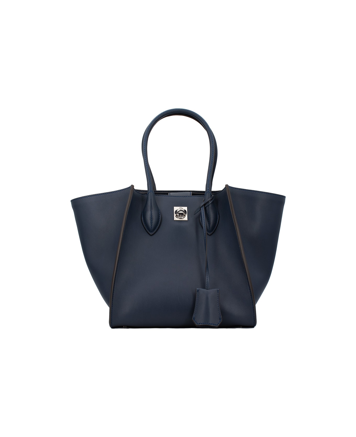 Hand bag made of smooth leather with saddle stitching, inside pocket with zip and card holder, metal clasp with swivel fastening. Dimensions: 25 x 25 x 18 cm. Composition: 100% LE