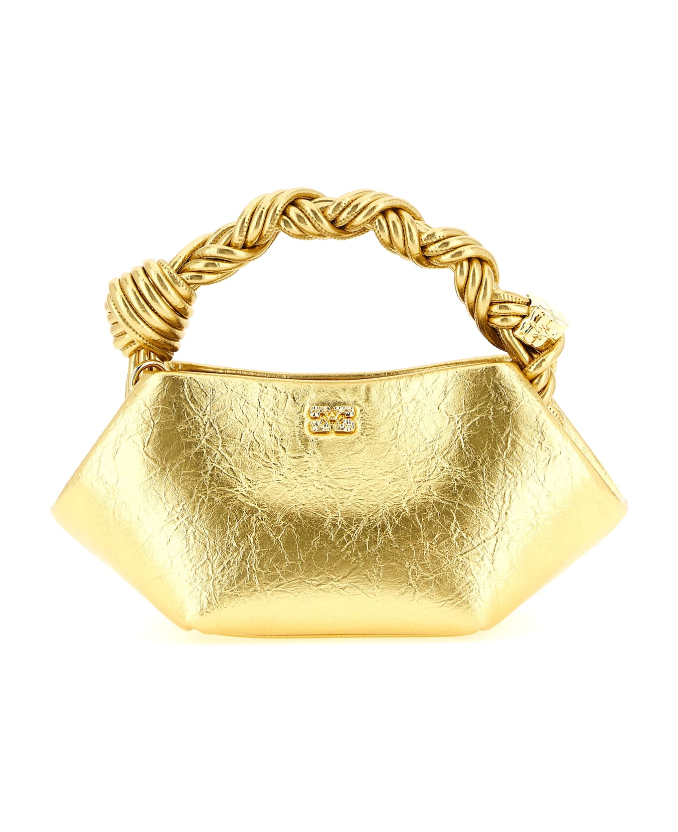 Bou' mini handbag in craquelé metallic leather-effect fabric, tone-on-tone metallic 'Ganni Butterfly' logo on the front, inner magnetic closure, fixed braided handle with tone-on-tone metal knot and nut, adjustable and removable shoulder strap, and back embossed logo. SUSTAINABLE: product made from recycled materials.