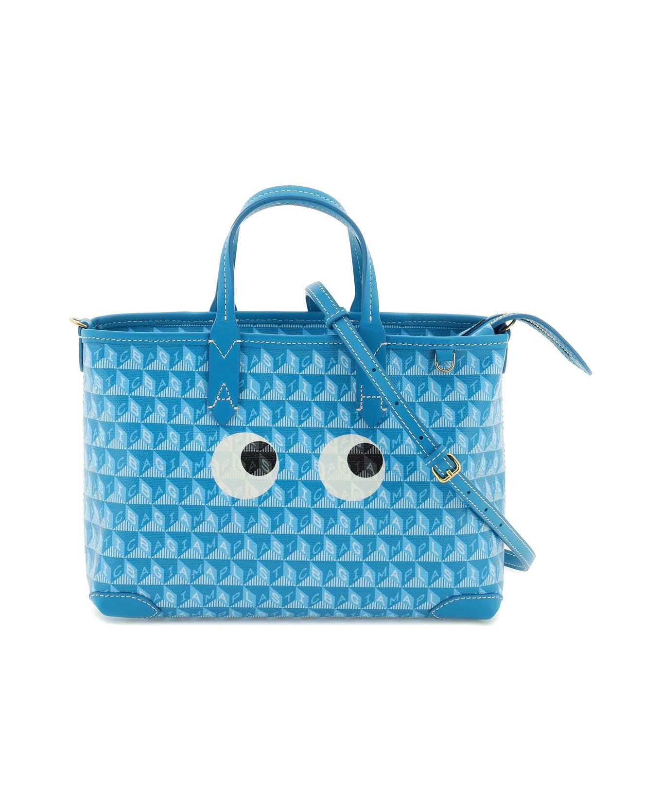 "I am a Plastic Bag" handbag by Anya Hindmarch made from an innovative coated canvas created from recycled plastic with eco-friendly leather finishes. All-over lettering graphic motif with the iconic Eyes print on front, topstitched AH initials on the double handle base. Zip closure, adjustable and detachable thin shoulder strap, unlined interior with a small open flat pocket. Gold-tone metal hardware.