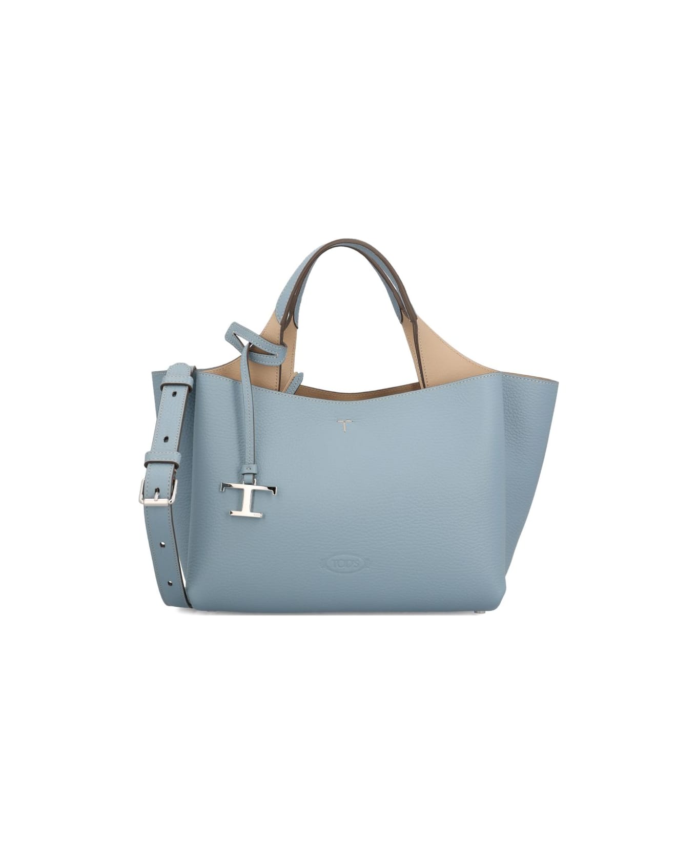 light blue pebbled texture top handle detachable shoulder strap 't' charm embossed logo detail Composition: Furs & Skins->leather100. , 0%