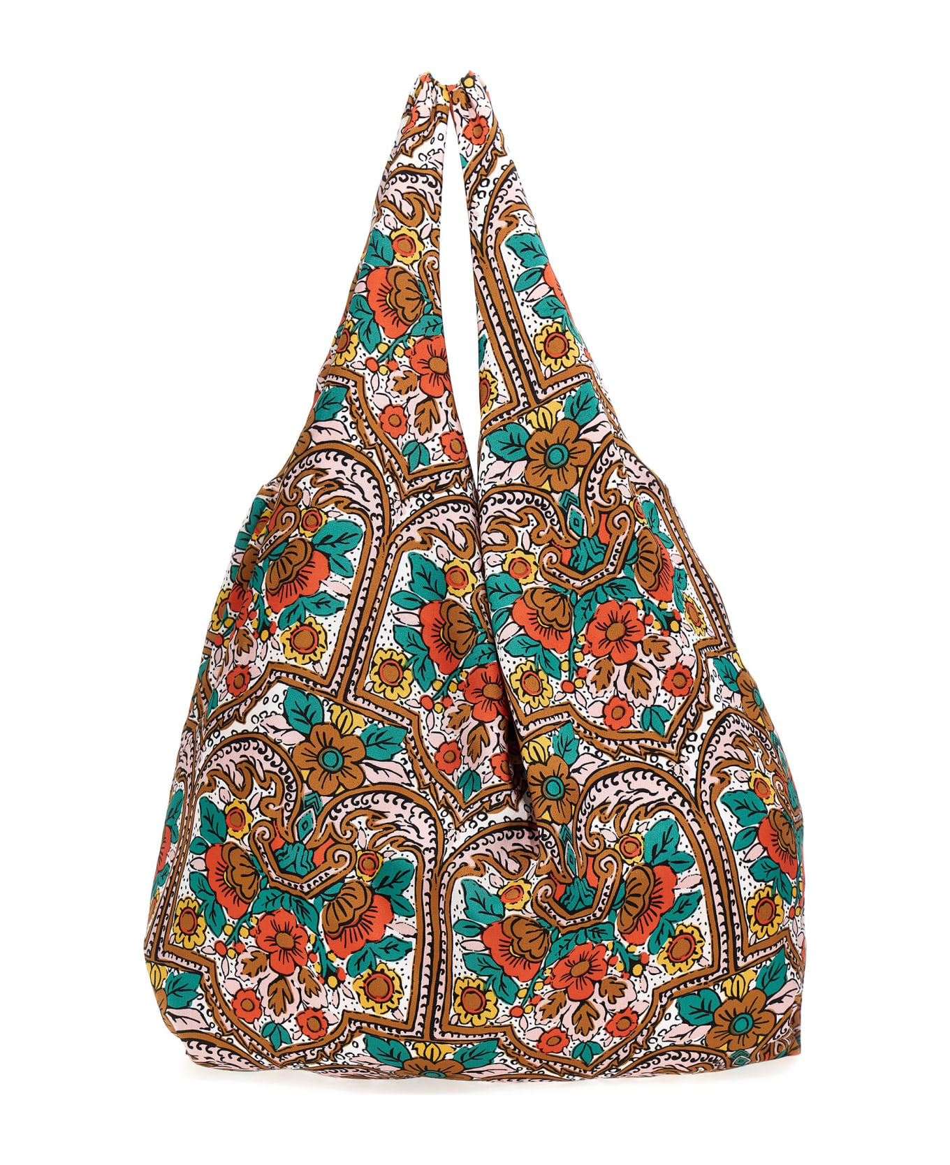 Reversible satin shopping bag with floral print on one side and striped print on the other. Composition: 100% polyester