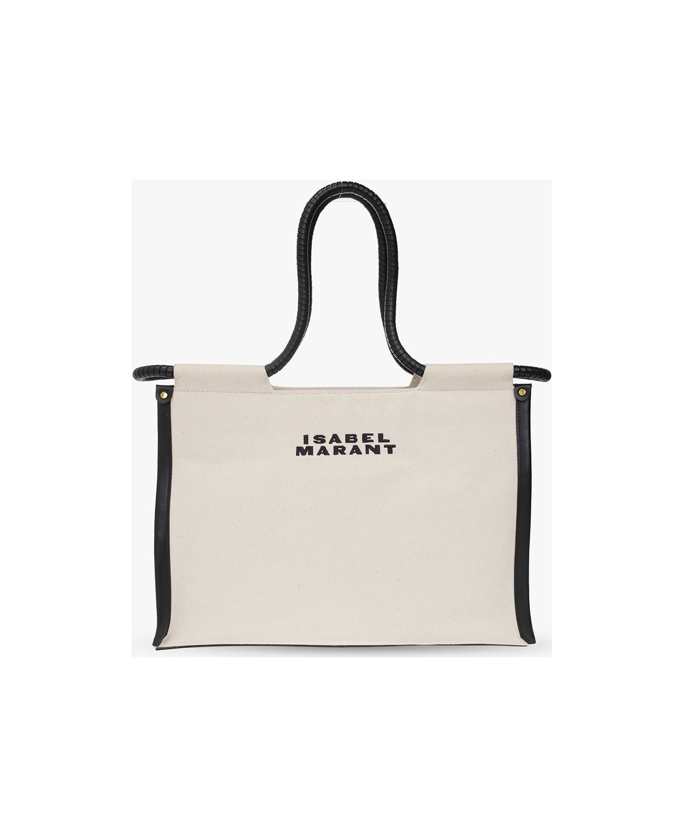 Beige and black 'Toledo' handbag from Isabel Marant. Made of cotton with leather trimming, this design features a logo embroidery, two half-round woven handles, antique gold-tone and one internal compartment with one slip pocket.