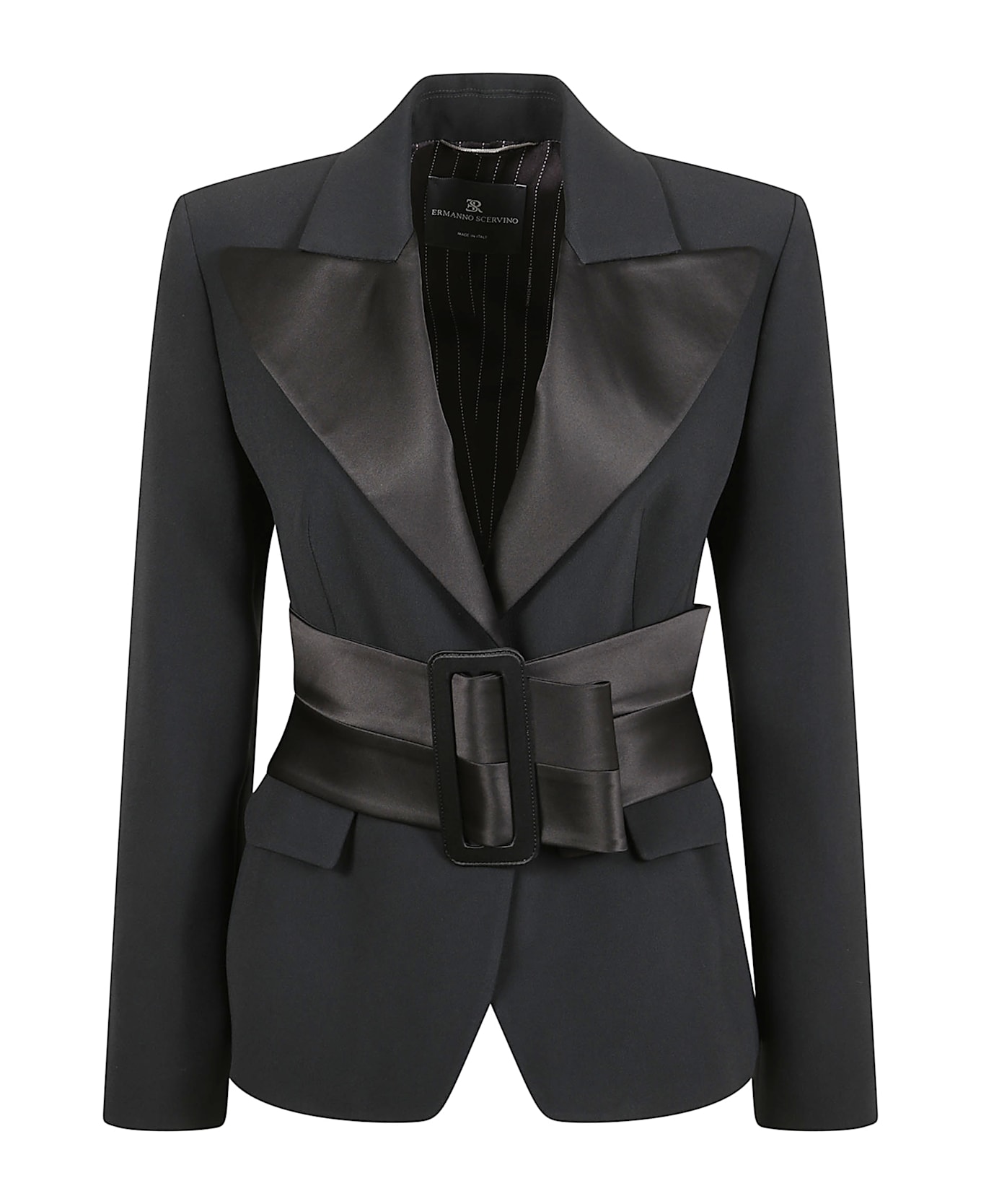 With its architectural lines and wide lapel collar, this short blazer embodies the contemporary sophistication of Ermanno Scervino. Structured by discrete shoulder pads and enhanced by an enveloping belt with rectangular buckle, it reveals a perfectly mastered appeal. The contrasting topstitching and fabric-covered buttons affirm a meticulous attention to detail.