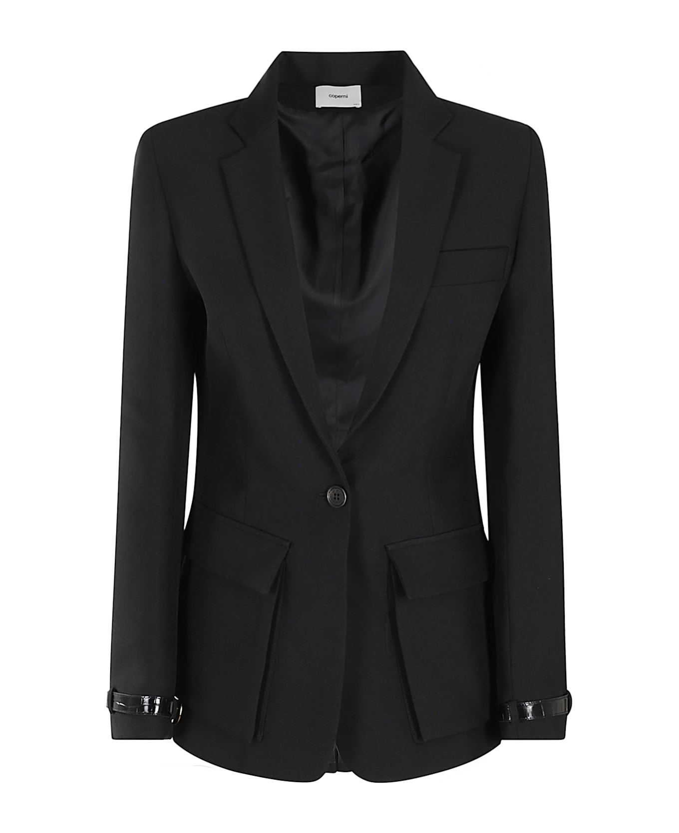 Tailored blazer - Coperni - Black color - Wide scoop neckline with lapels - Long sleeve with shiny leather strap and logo buckle at hem - Flush chest pocket - Maxi front patch pockets with flap - Single breasted button closure - Back slit - Regular fit