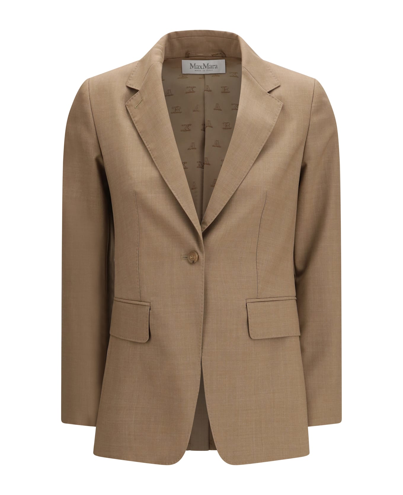 The single-breasted wool blazer by max mara showcases refined, timeless tailoring. crafted from lightweight pure virgin wool mélange canvas, it features a one-button single-breasted closure and mirrored notch lapels that enhance its clean lines. welt pockets with flaps at the sides and buttoned cuffs complete the classic design. a slim silhouette with a back vent ensures a flattering, comfortable fit, while the monogram fabric lining adds a distinctive, sophisticated finish.