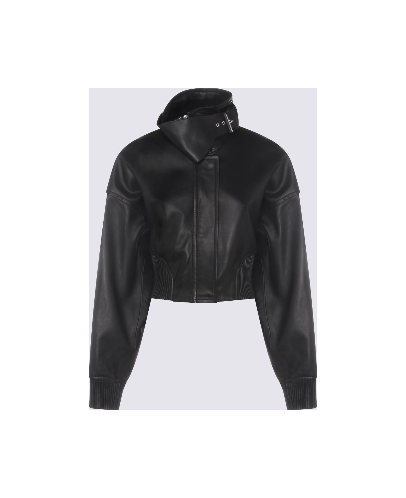 Black leather jacket from Sportmax featuring high nekc, long sleeves, buttons fastening and short length. Composition: _, 100% Le