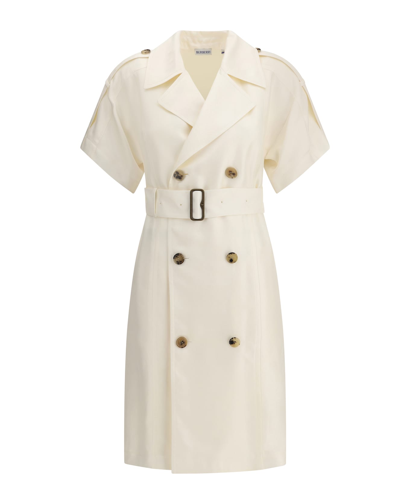 Burberry's belted trench dress blends sartorial elegance and heritage inspiration. featuring wide lapels, a double-breasted button closure and knee length, it has two side welt pockets and pouch pockets for added functionality. the design echoes iconic elements of the brand's traditional trench coat, such as structured epaulettes and a waist belt that enhances the silhouette.