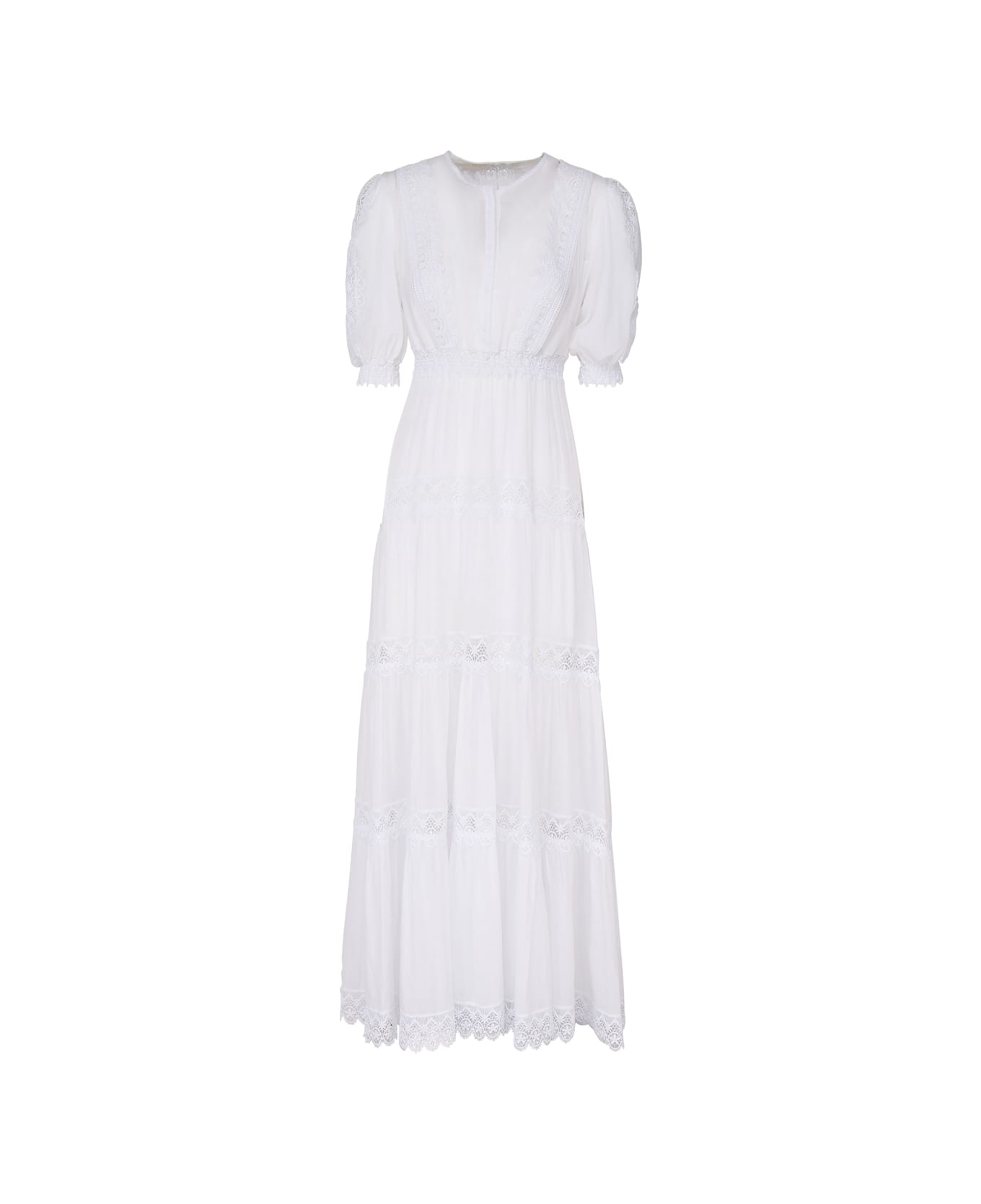 -Cotton blend dress -Lace detail -Front closure with buttons -Crew neck -Short sleeves with elasticated cuffs -Elastic waist -Flounced skirt -Colour: White