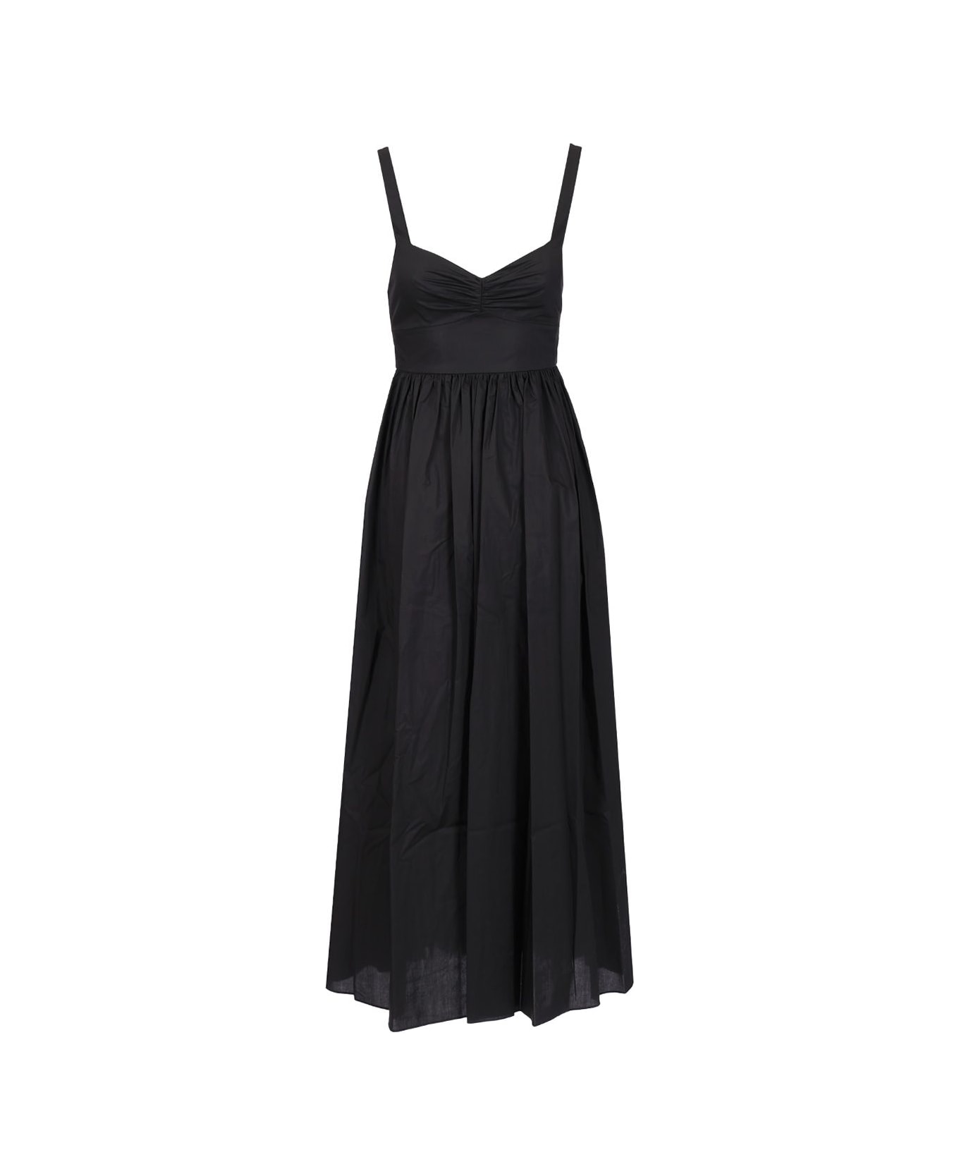 Black cotton poplin midi dress from Matteau with corset top and gathered skirt at the waist.