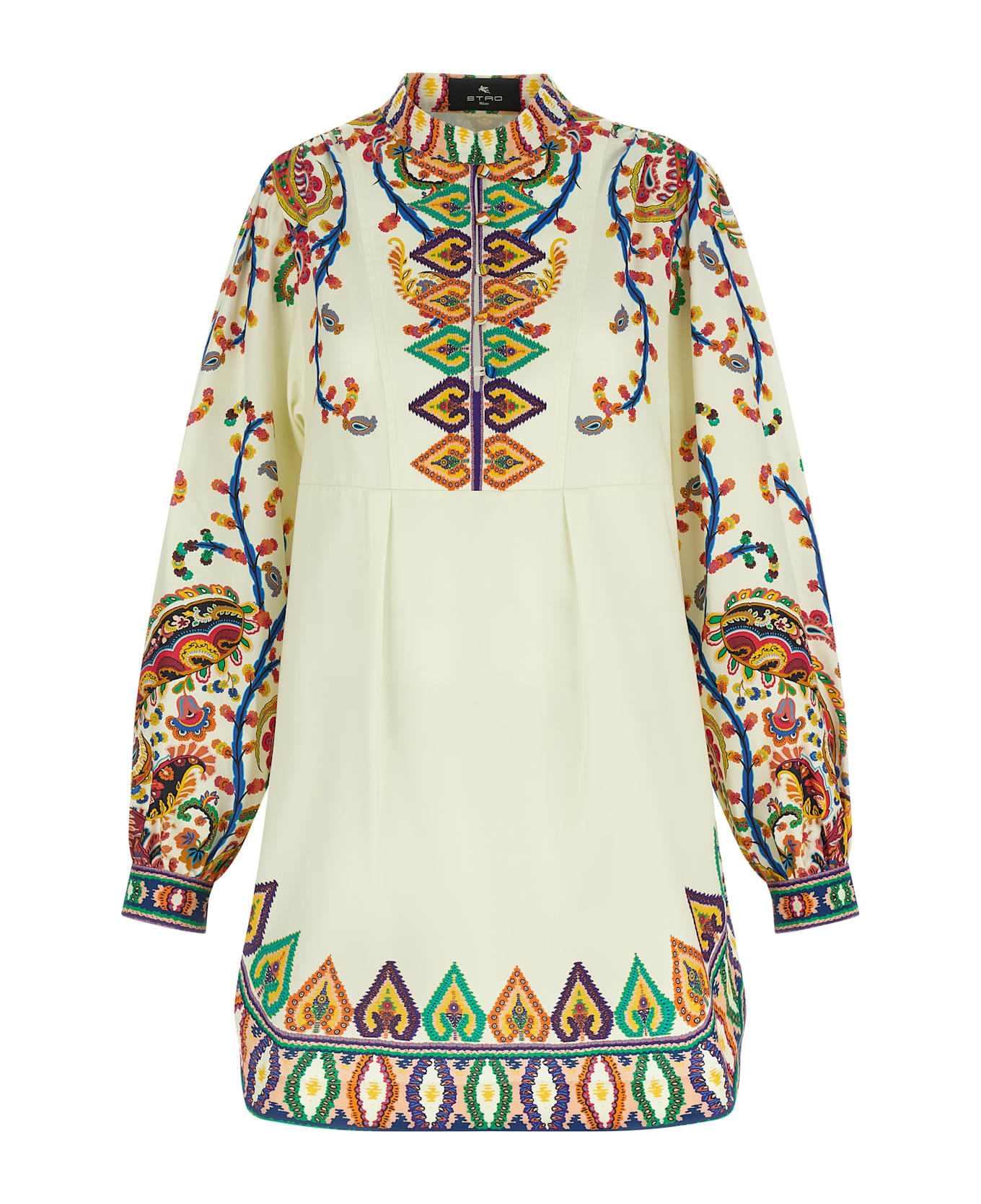 Cotton poplin mini dress with Paisley print placed, mandarin collar, front closure with covered buttons, side pockets, round hem, long wide sleeves on the slightly curled hem with button-opening cuffs. Composition: 100% cotton