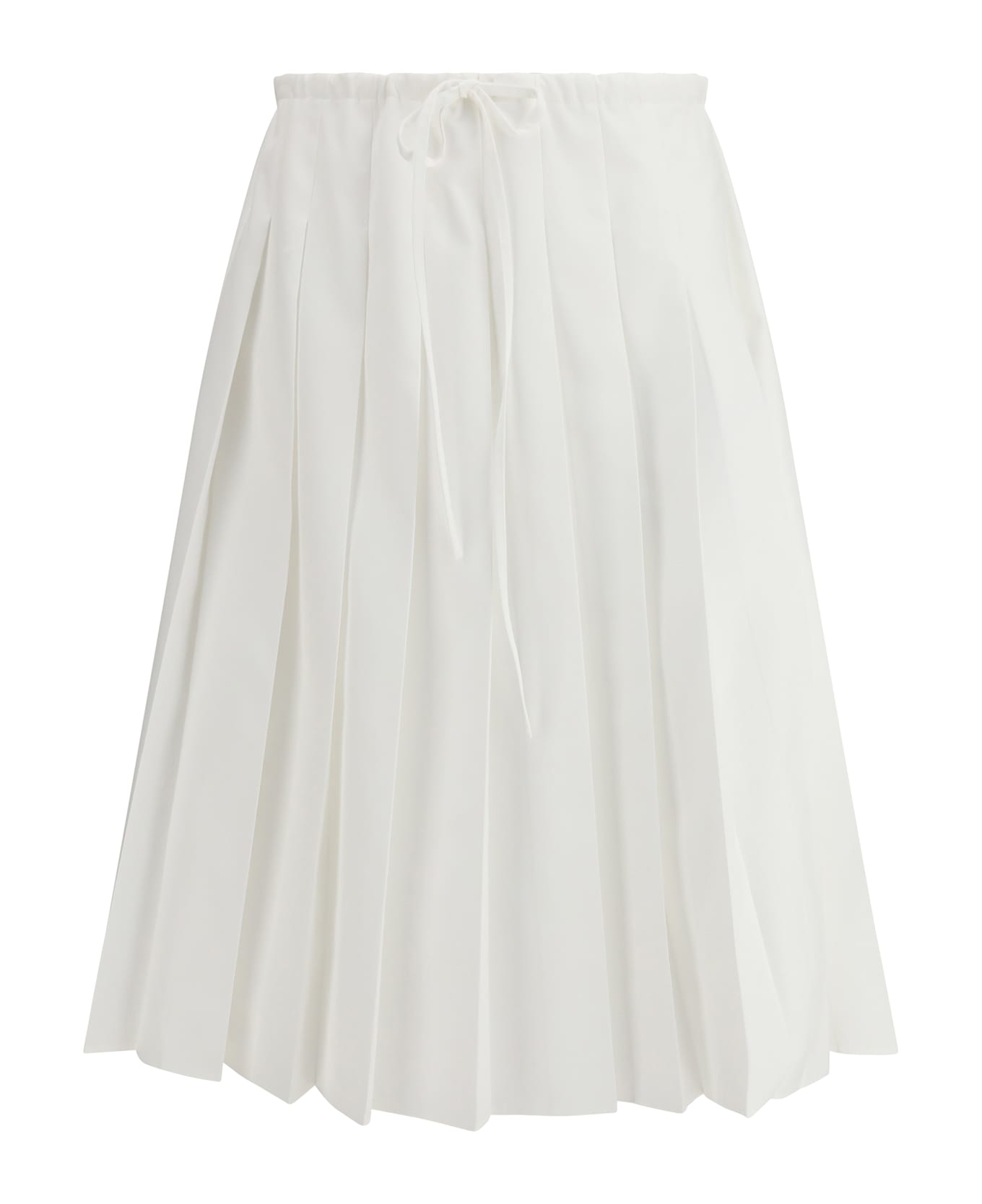 The pleated jersey skirt by prada blends lightness with subtle retro inspiration, defined by precise pleats and a naturally fluid movement. crafted from lightweight jersey and left unlined to enhance its softness, it features a front tie closure that adds a refined, understated detail. the fabric triangle logo with sartorial label finishes the piece with the maison s signature touch.