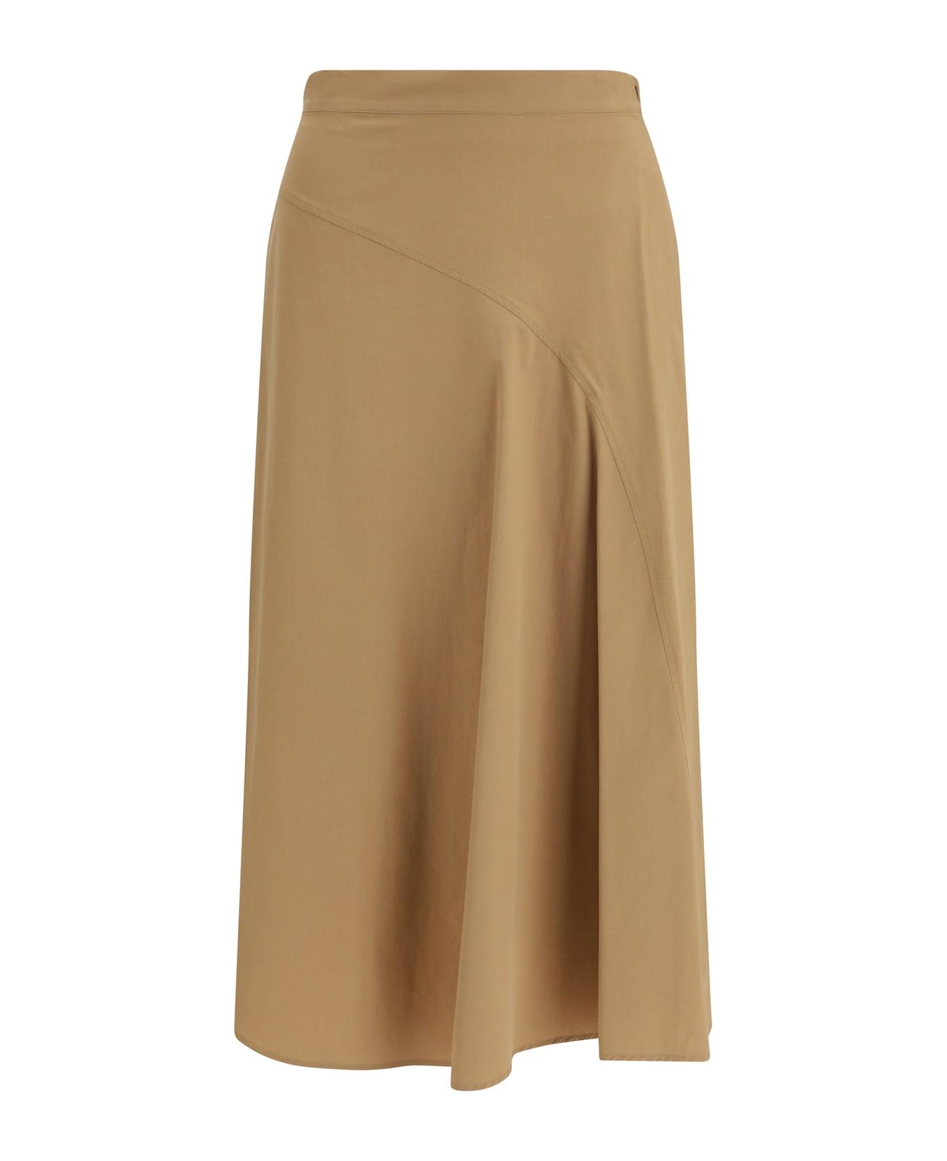 The zattera midi skirt by weekend max mara is crafted from pure cotton poplin and features a flared silhouette that adds lightness and movement. the design is defined by cut details on the front and back, enhancing the garment s volume. it offers a regular fit, invisible side zip closure on the left, and side seam pockets. unlined, it is a fresh and versatile piece, perfect for the warmer season.
