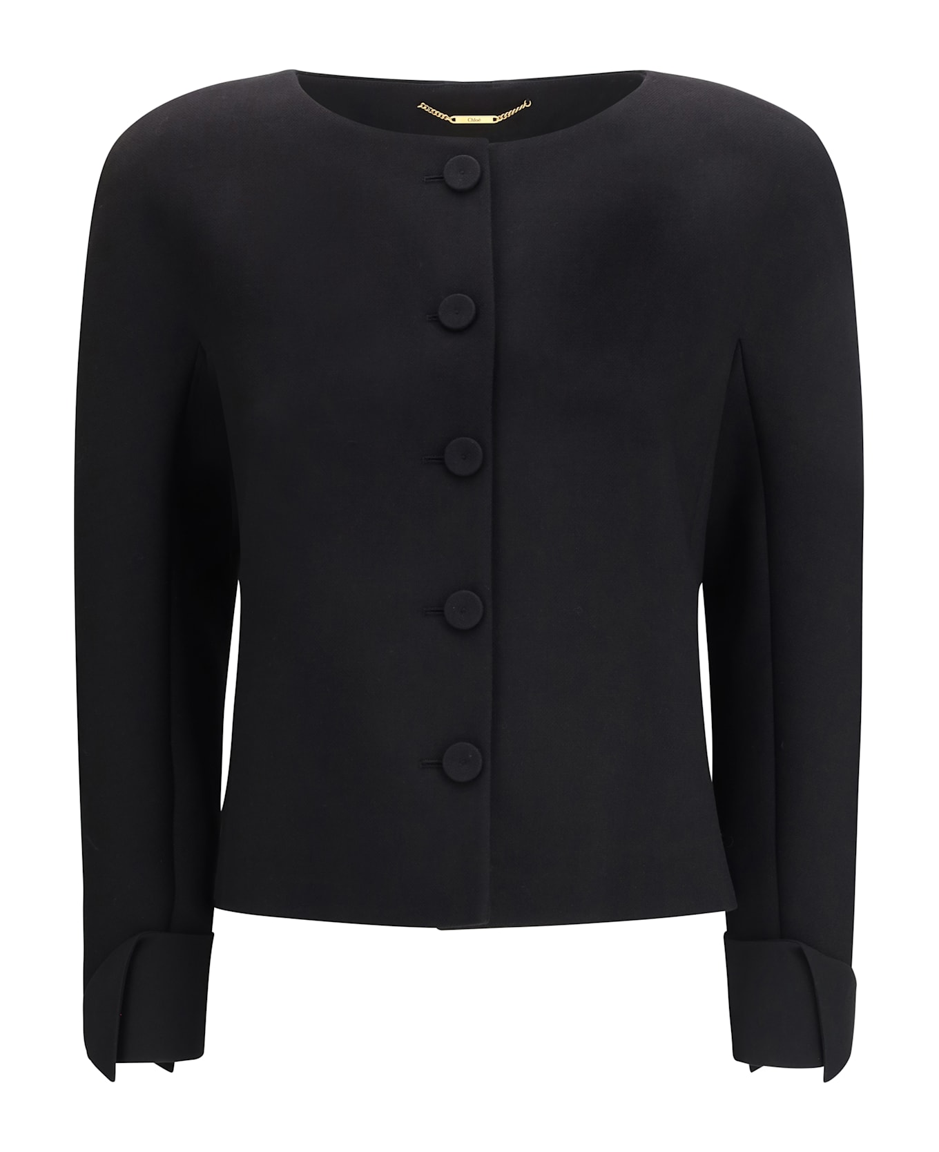 The collarless fitted jacket by chloé in wool crêpe features a tailored silhouette that enhances the figure with understated elegance. the wool crêpe fabric provides a soft yet subtly structured texture, ideal for a refined and contemporary look. the minimalist collarless design reflects the clean and sophisticated aesthetic that defines chloé.