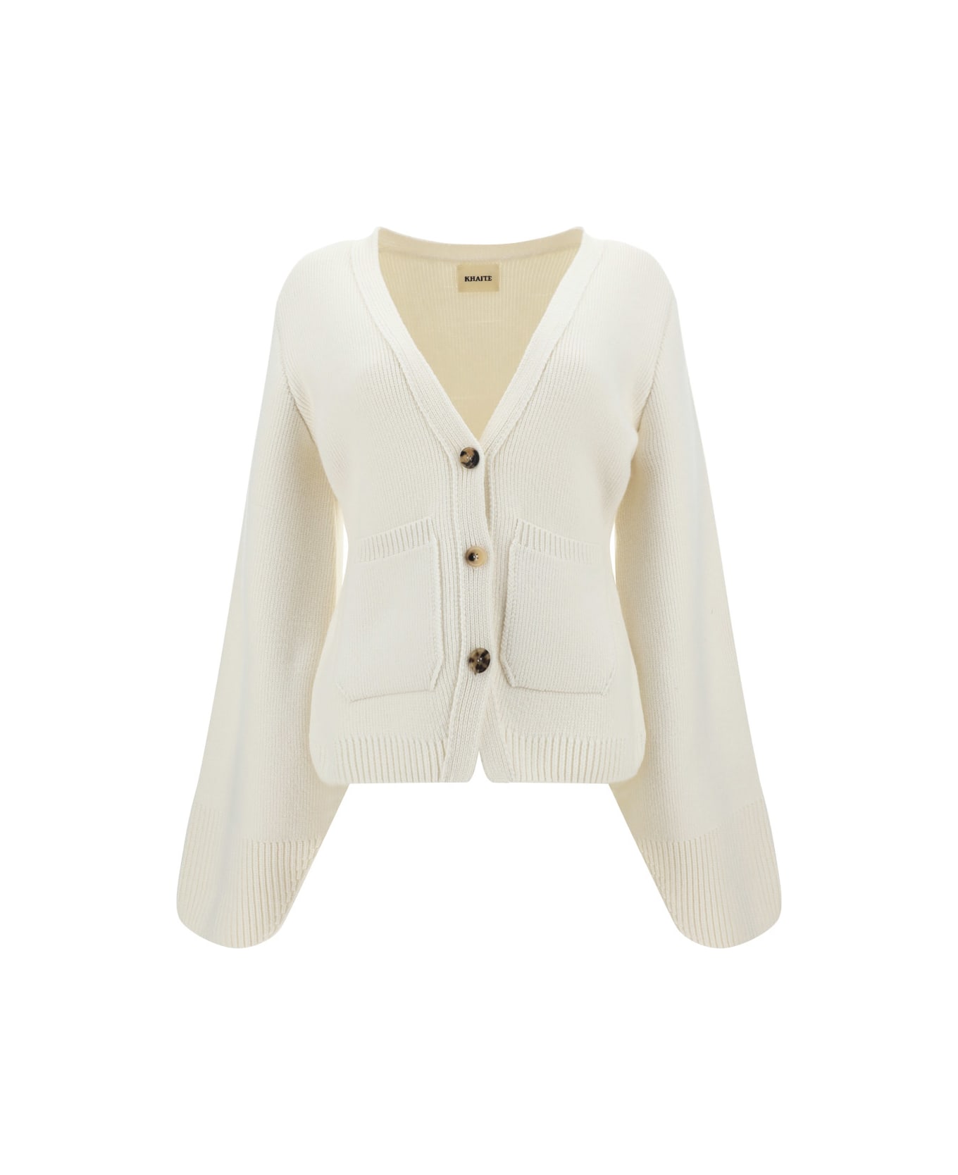 Cashmere cardigan by khaite, button closure, v neck line, two front pockets, ribbed cuffs and bottom hem, long and wide sleeves. Composition: 100% % Kashmir/capra Hircus