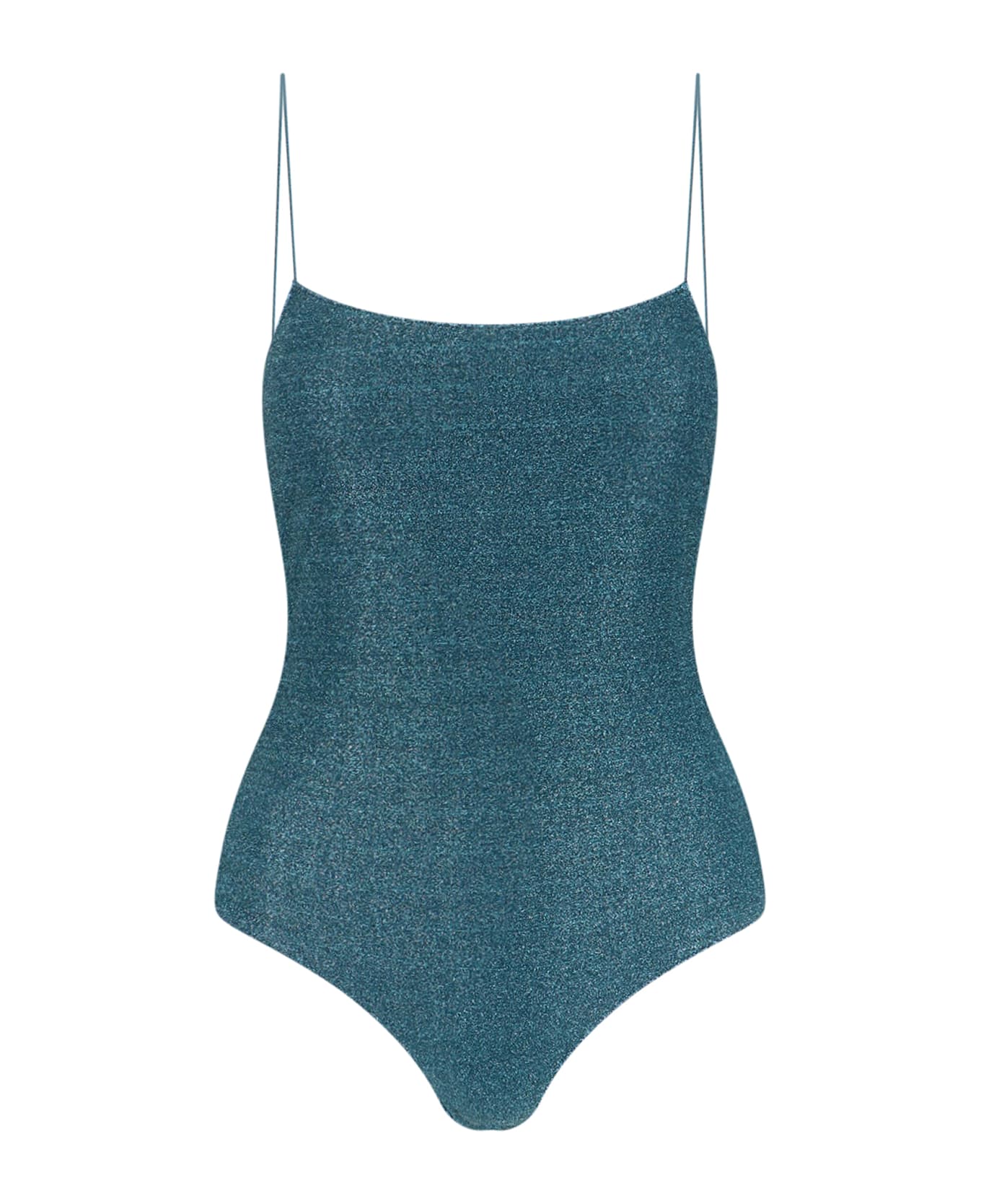 Oseree lumière one-piece swimsuit in blue metallic fabric with thin straps, back neckline, back tie closure, classic briefs, adjustable laces, and a logo pouch.