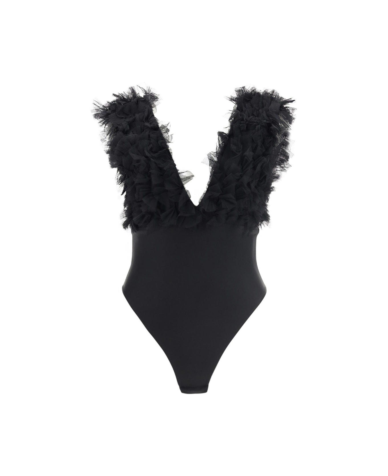 Elba bodysuit by pinko, sleeveless model in stretch fabric, straps decorated with tone-on-tone tulle ruffles, deep v-neck on front and back. Composition: 100% % Polyamide
